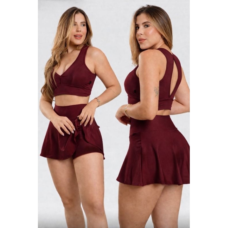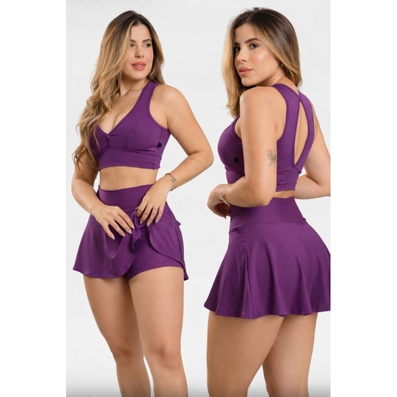 Conjunto Fitness Feminino Saia-Shorts + Top com Sustentação Academia Treino