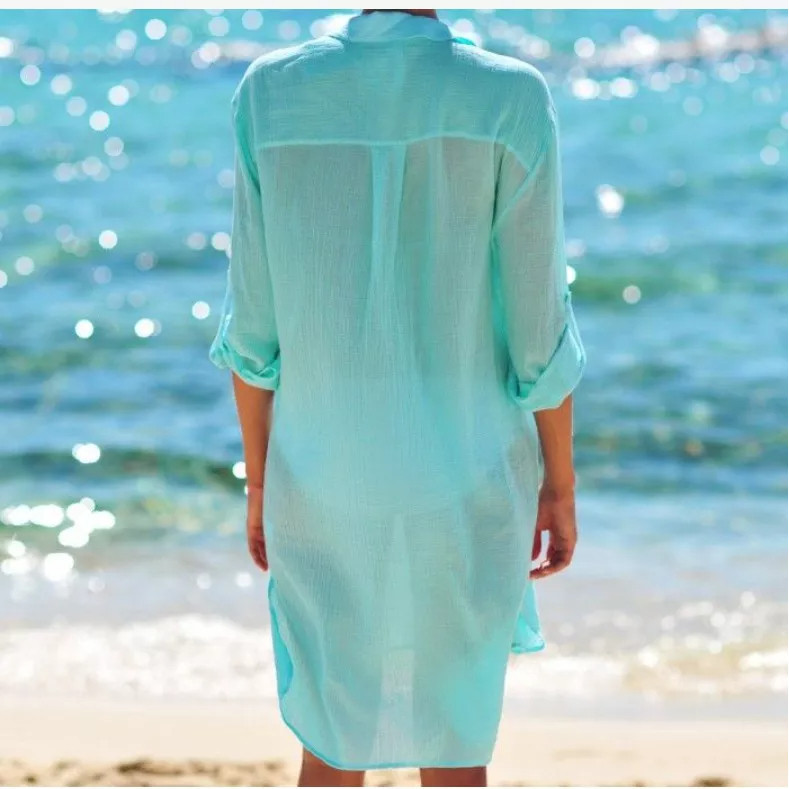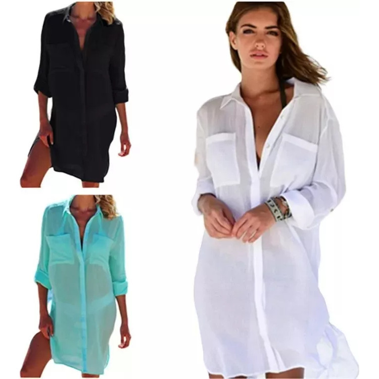 Saida de Praia Vestido Chemise Camisa Camisao - Premium Branco Manga Longa