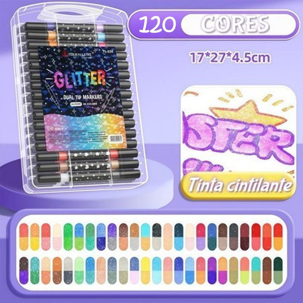 Caneta Marcadora acrílica Glitter Metalizada Ponta Dupla para Colorir Brilhante 72/96/120 Cores