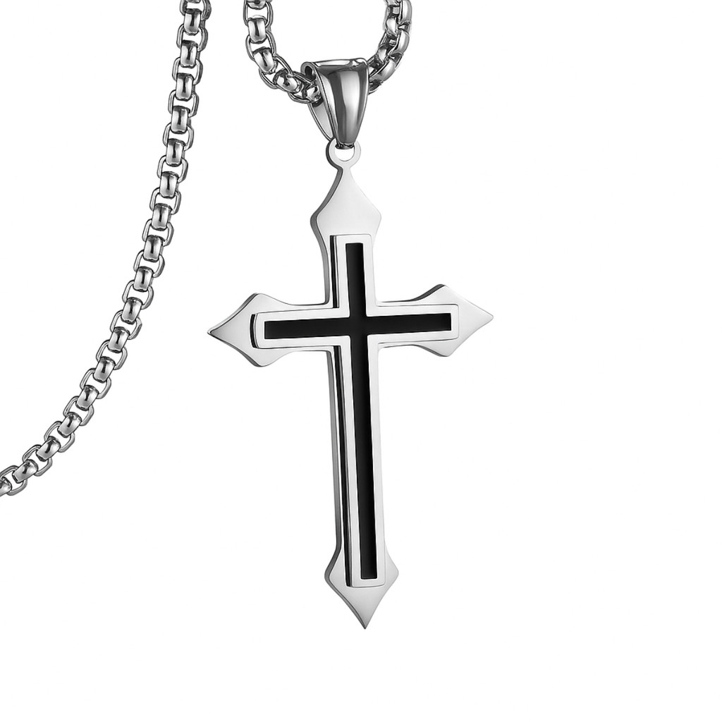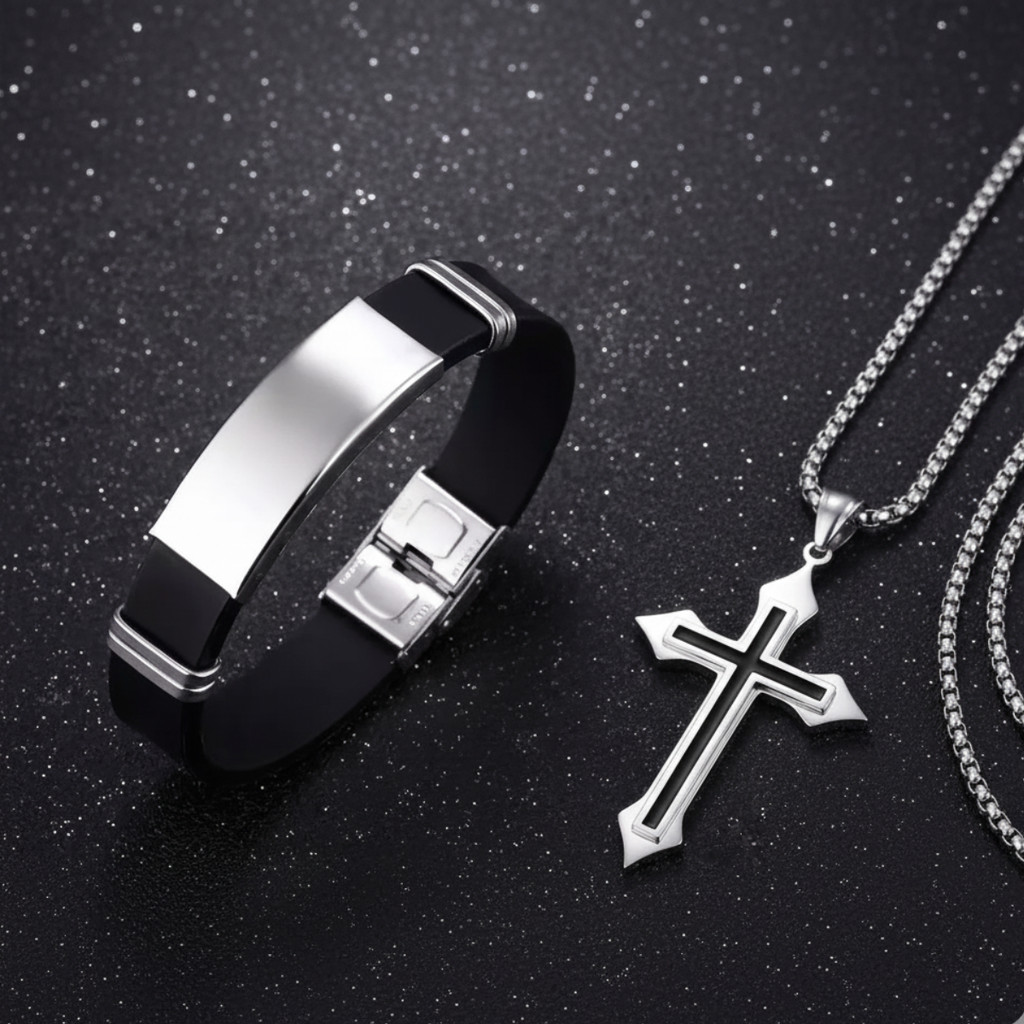 KIT Masculino Colar Cruz + Pulseira Aço Inox e Silicone | Acessórios Prata e Preto | Estilo Moderno