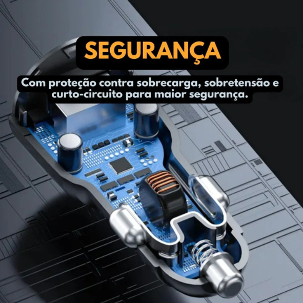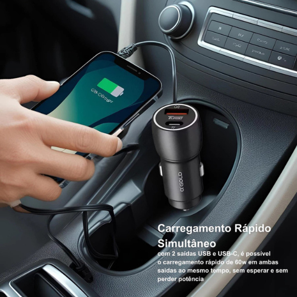 Kit Carregador Veícular Turbo 60W Com Entrada PD + USB-C Cabo Tipo-C/Tipo-C Para Android e iPhone