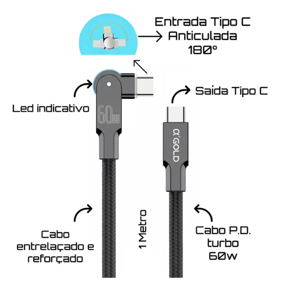Cabo De Dados PD 60W Rotativo 180° USB-C Para Tipo-C Trançado Compatível Com Android, iOS