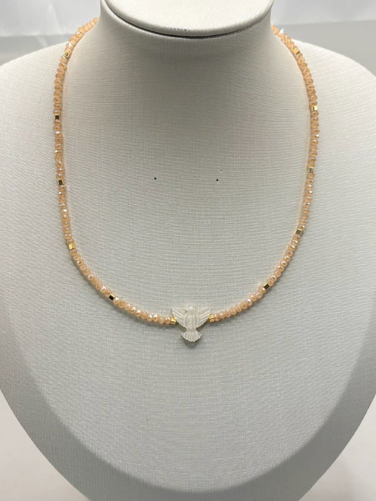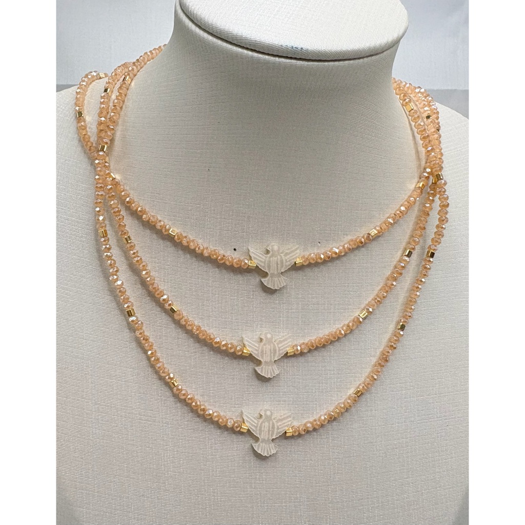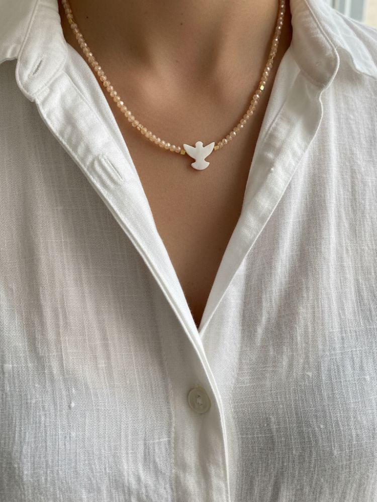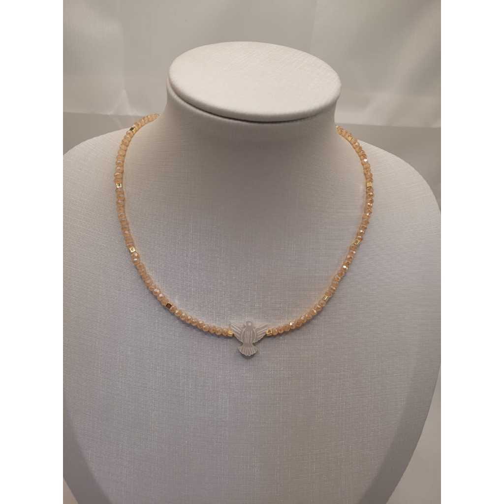 Colar feminino delicado com cristal de vidro ou fio de nylon com pingente Espirito Santo em madre perola sintética
