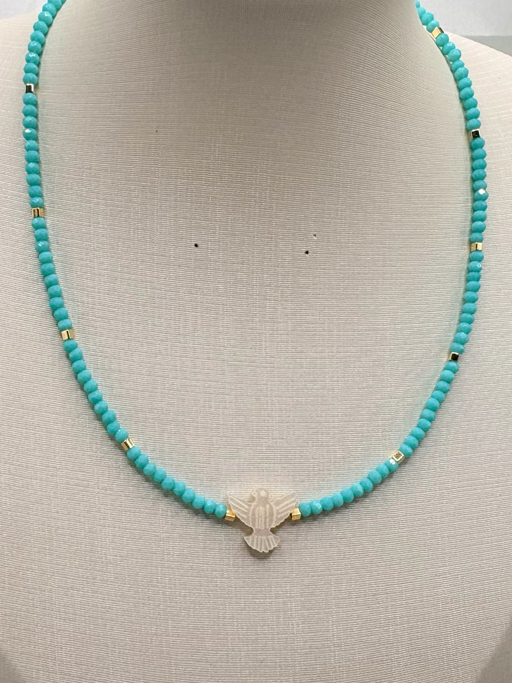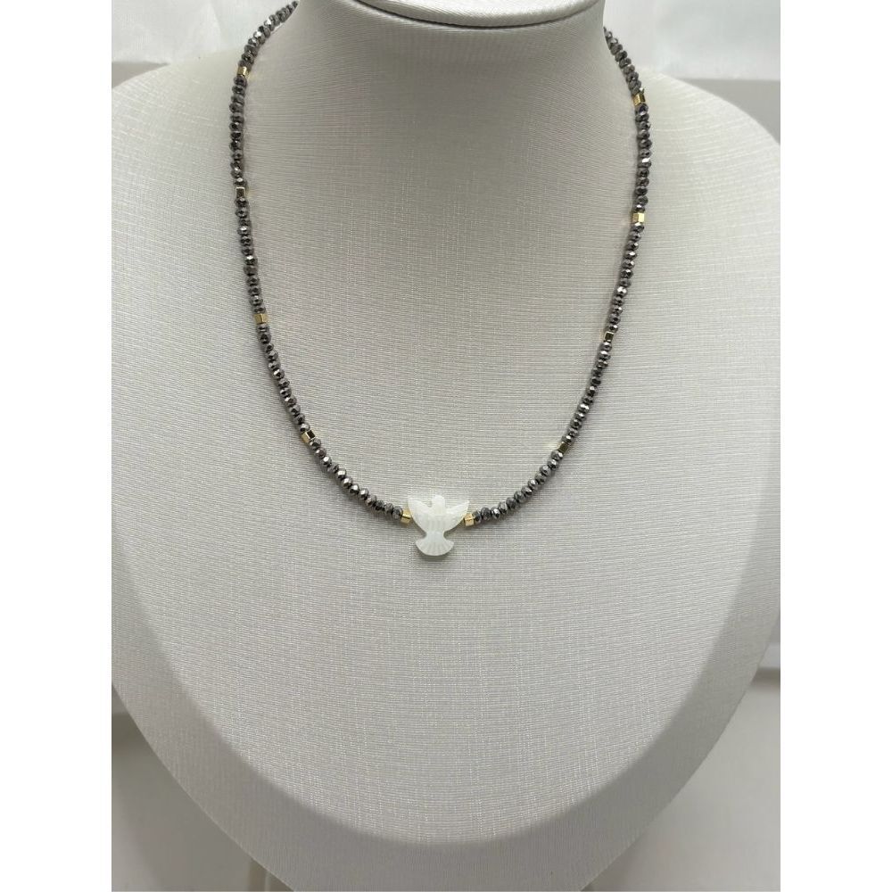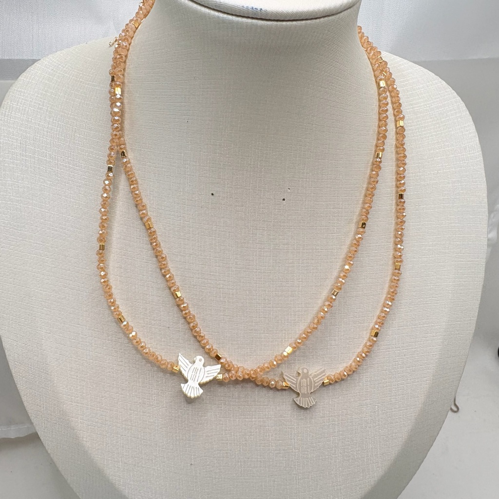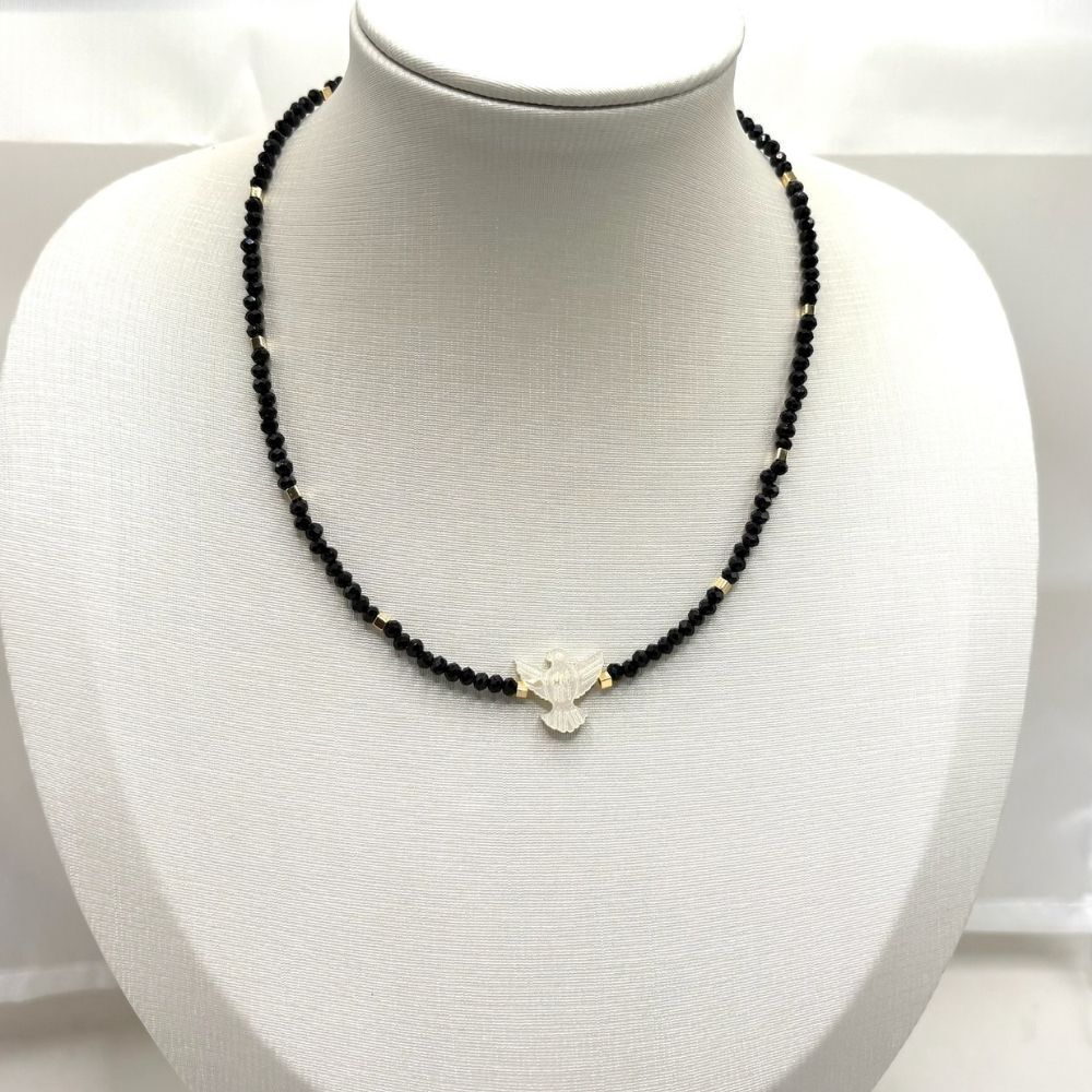 Colar feminino delicado com cristal de vidro ou fio de nylon com pingente Espirito Santo em madre perola sintética