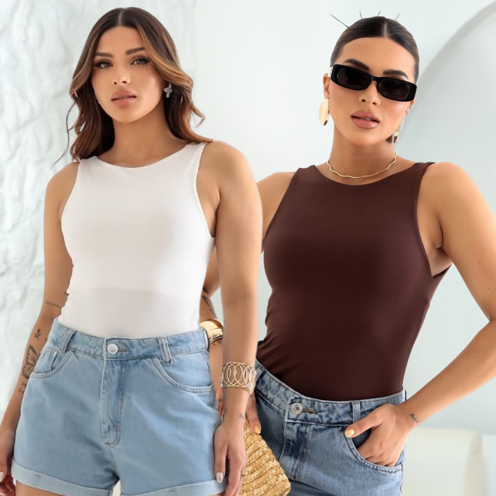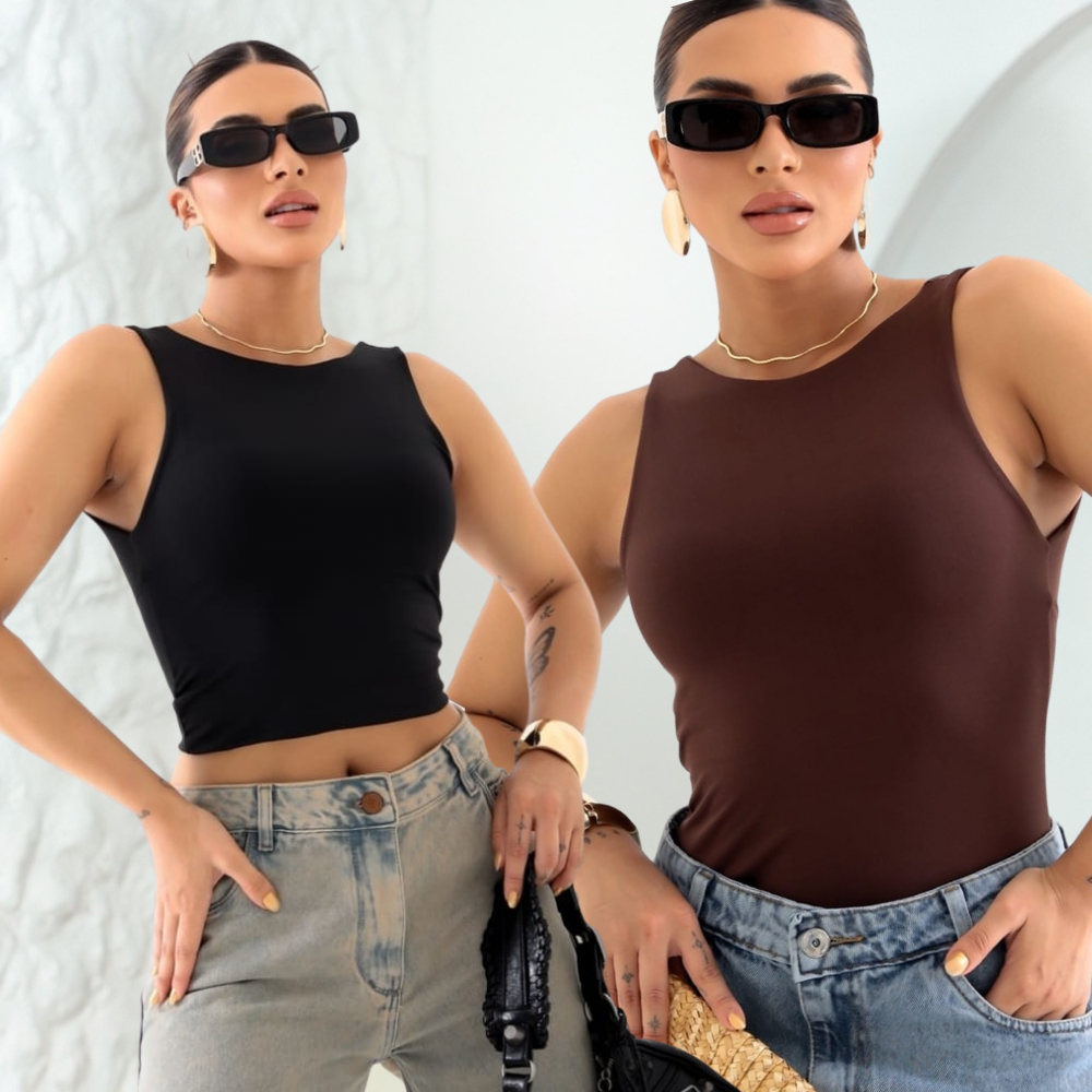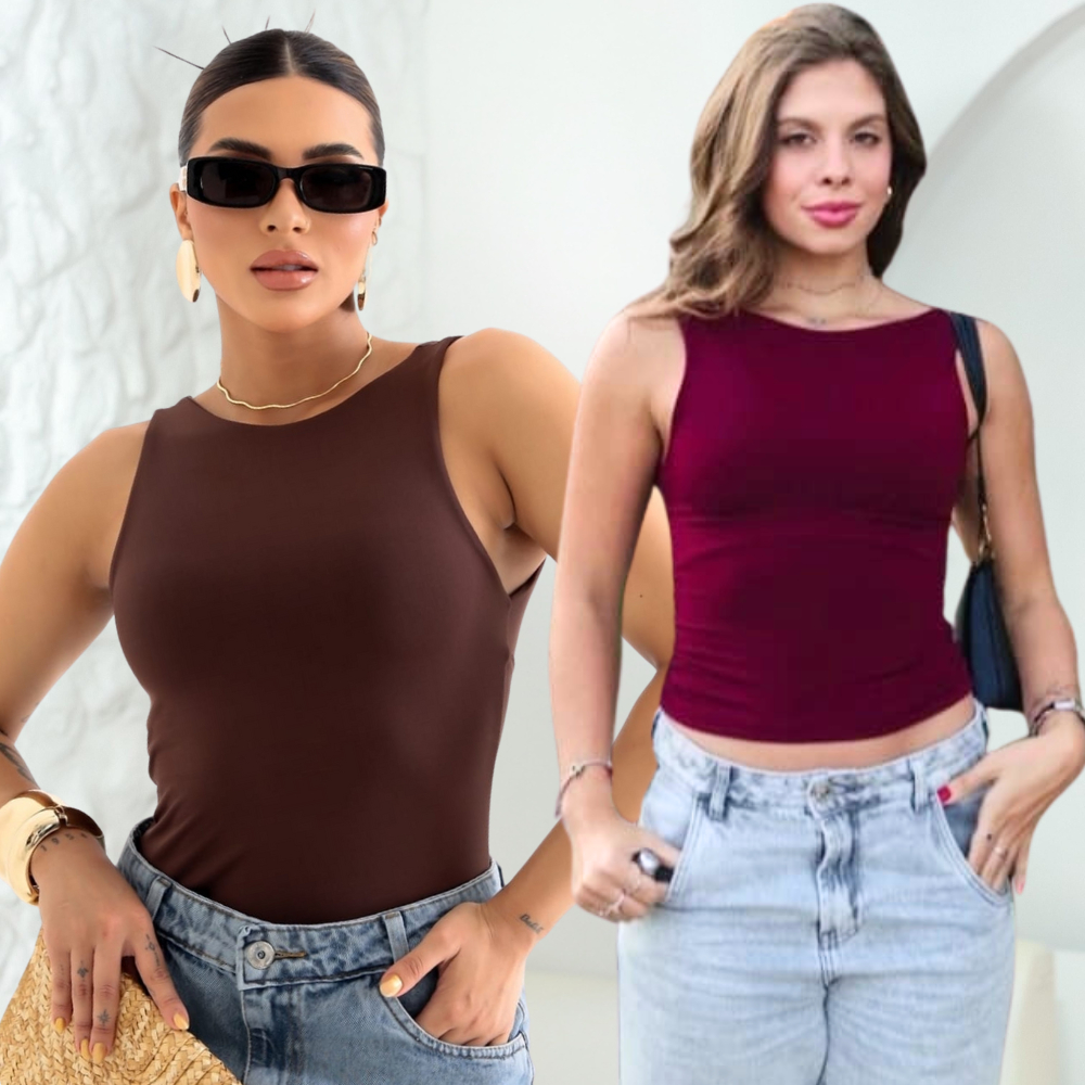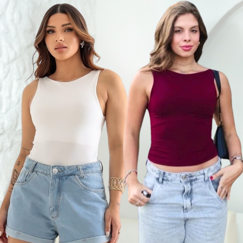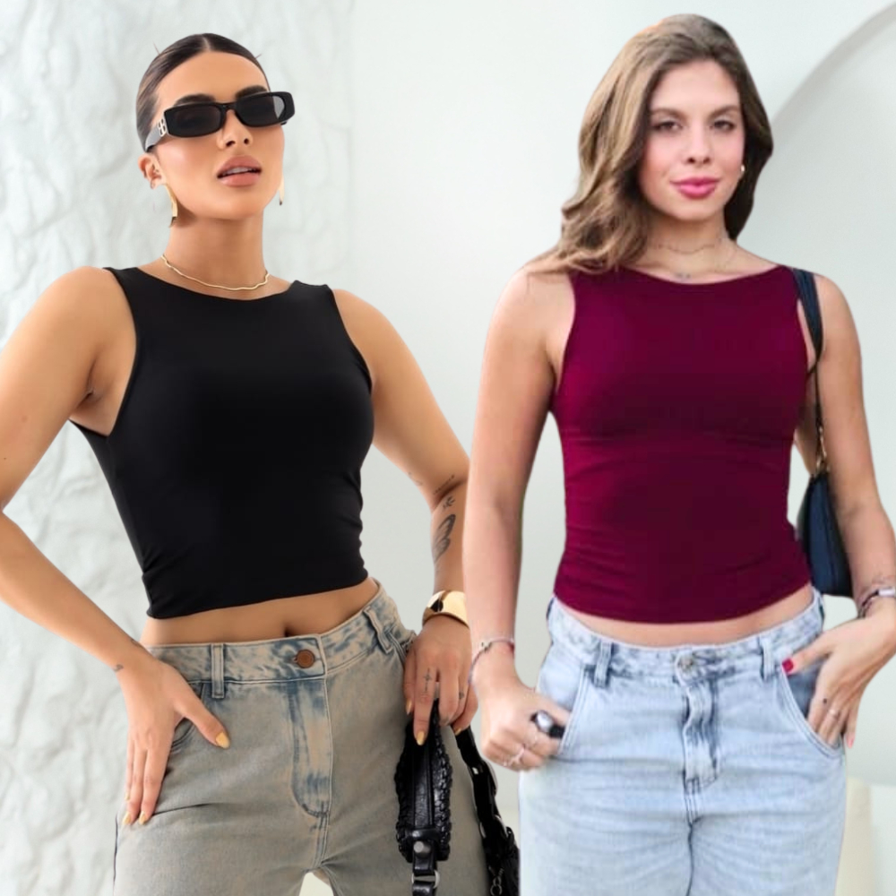 Kit 2 Cropped Feminino Blusa Regata Com Alça Costa Nua Decote Redondo Suplex Forro Duplo Verão Casual