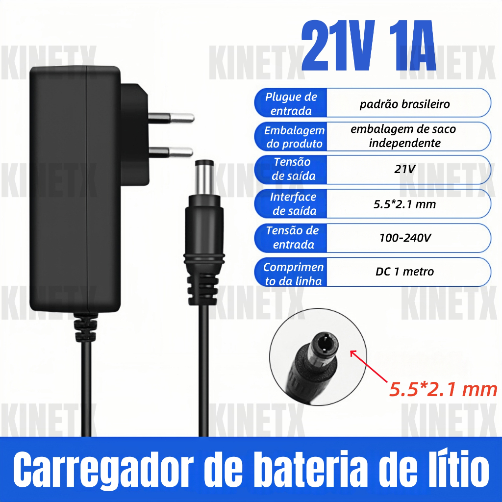 Carregador Universal 21V 1A Bivolt Automático 100-240V para Chave de Impacto e Parafusadeira com Proteção e Luz