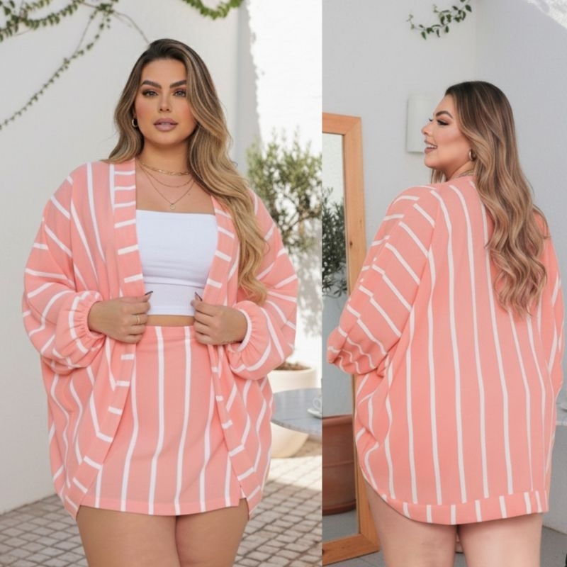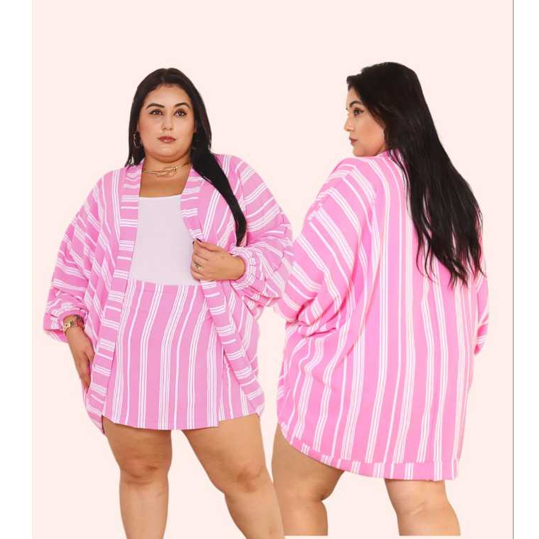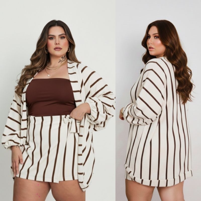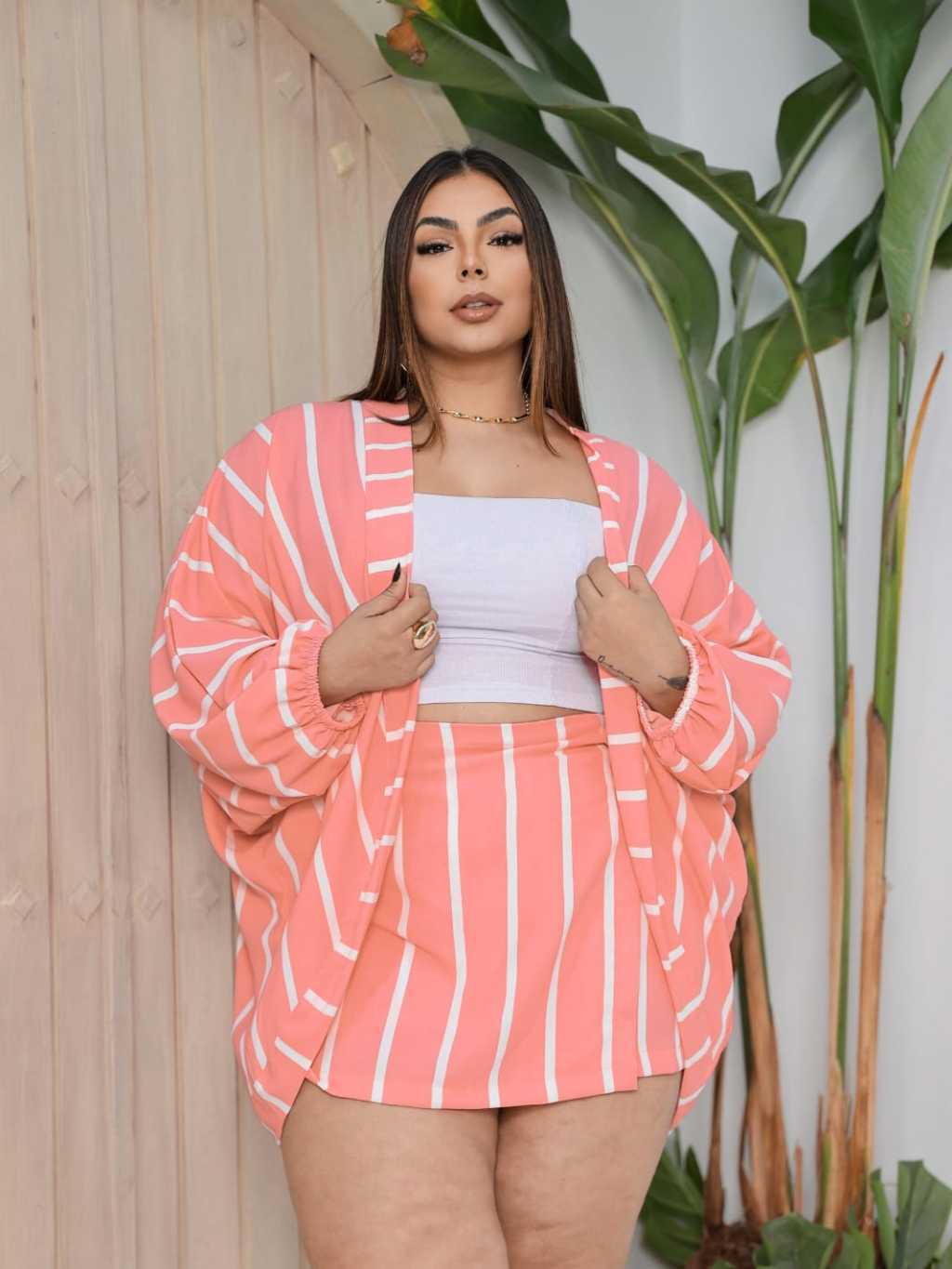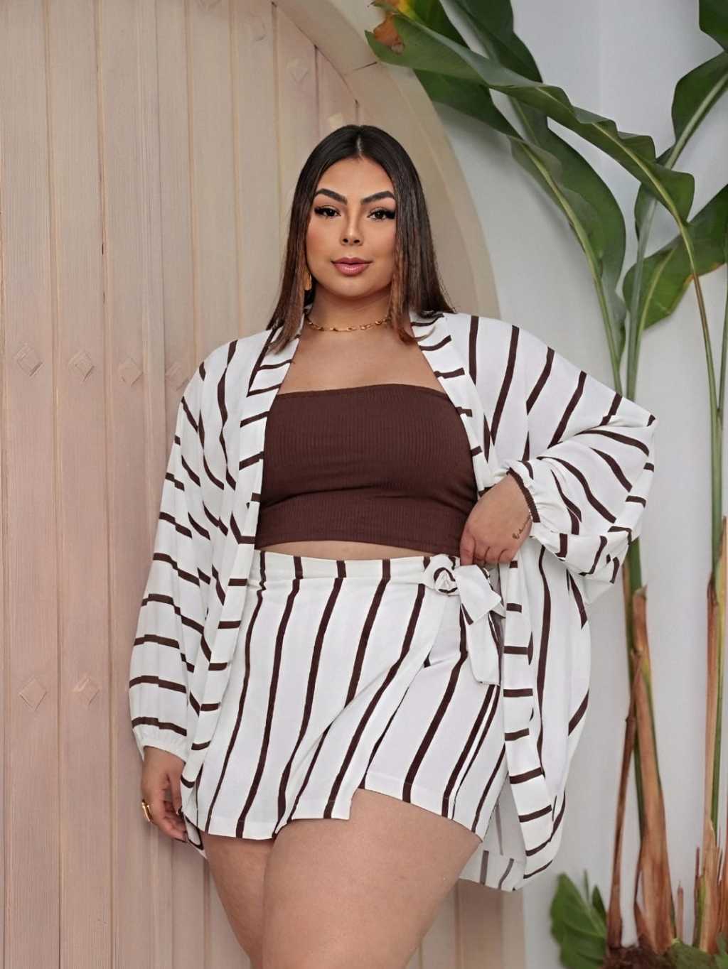 Conjunto Femenino Plus Size Listrado Kimono e Short Saia Moda Blogueira e Gringa com Elastex Cintura Listrado Lançamento