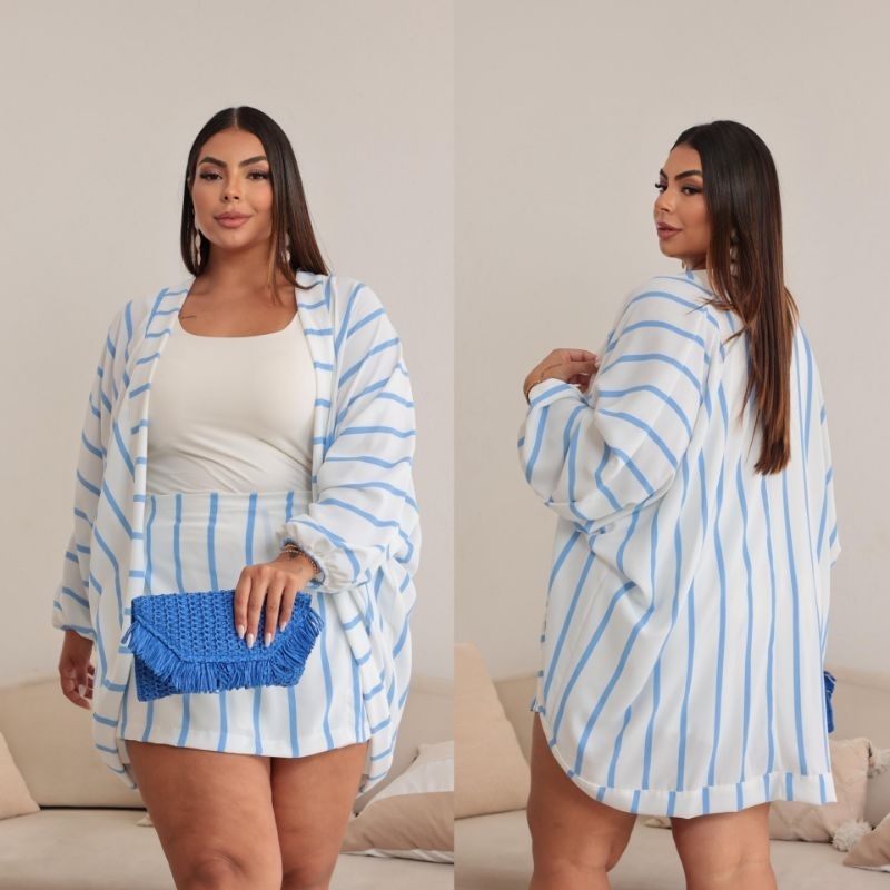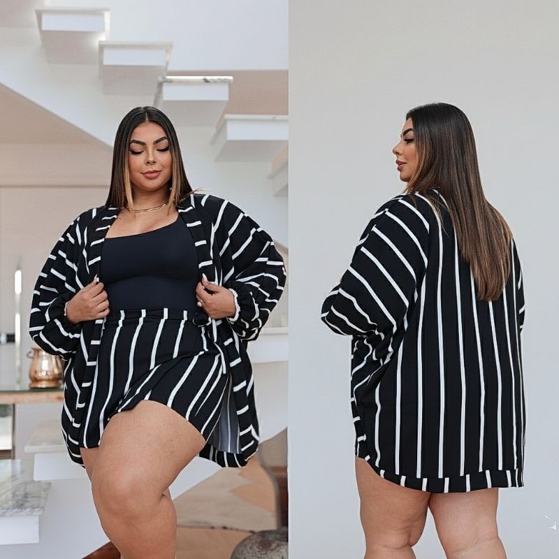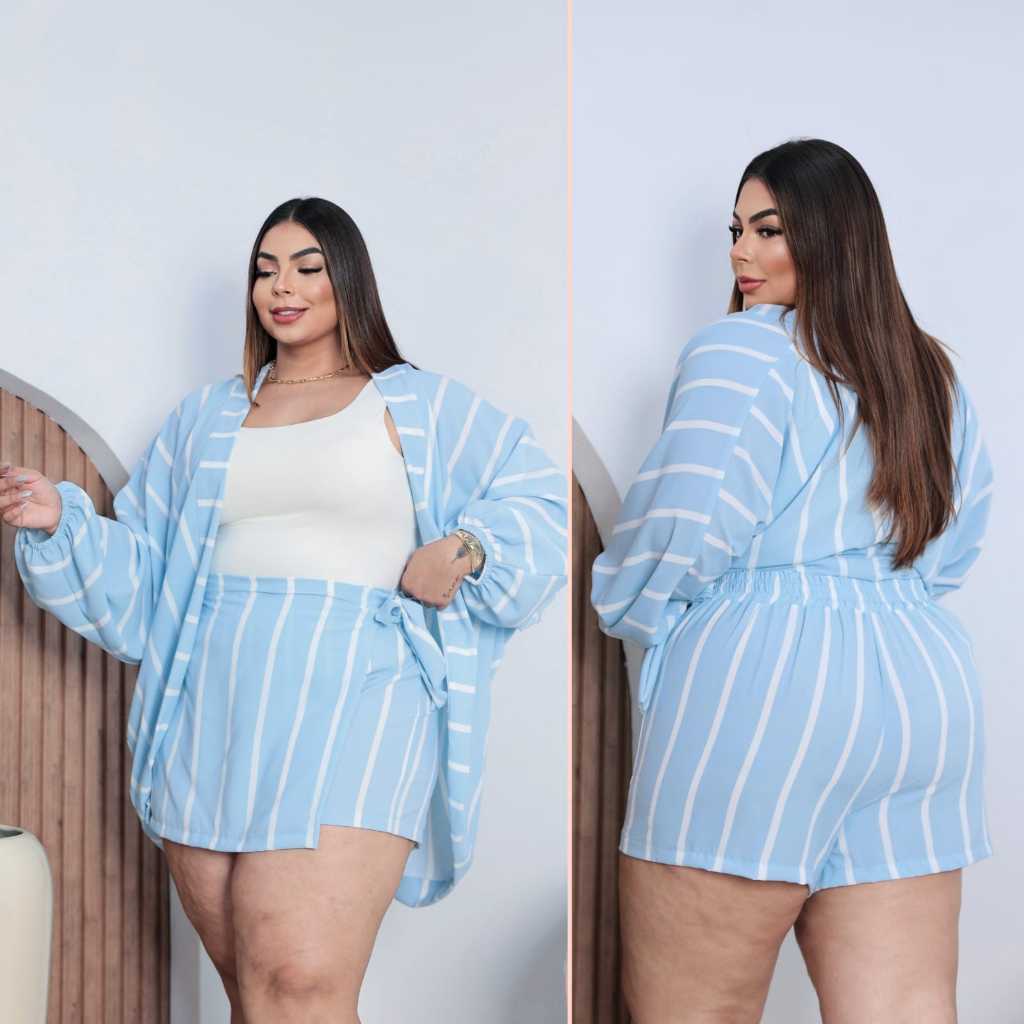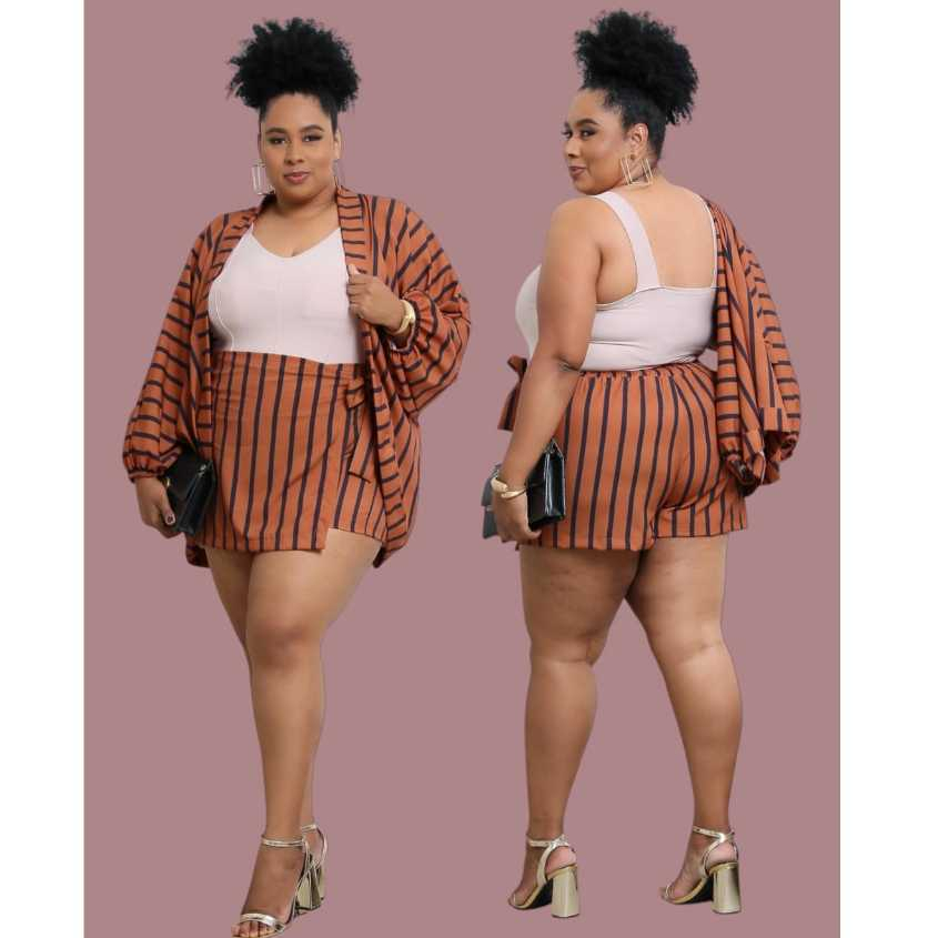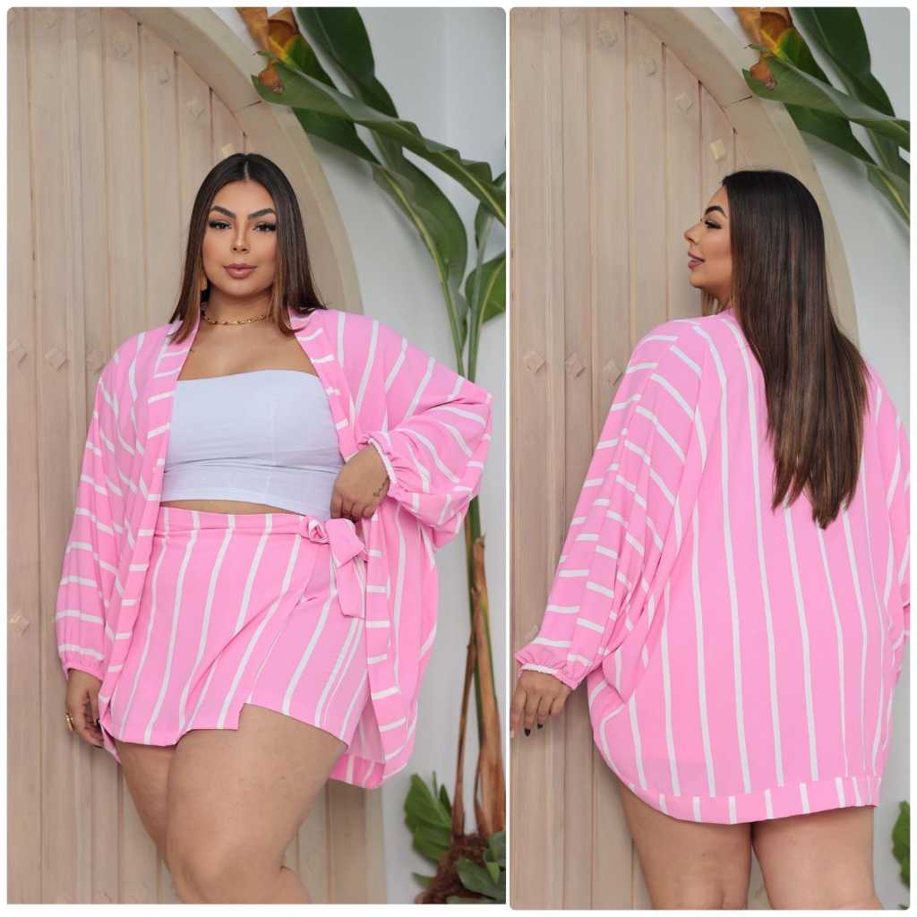 Conjunto Femenino Plus Size Listrado Kimono e Short Saia Moda Blogueira e Gringa com Elastex Cintura Listrado Lançamento