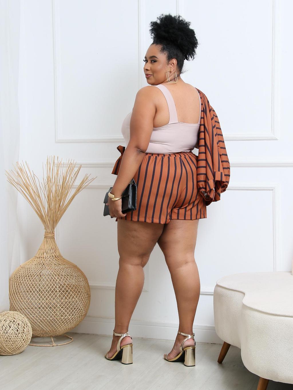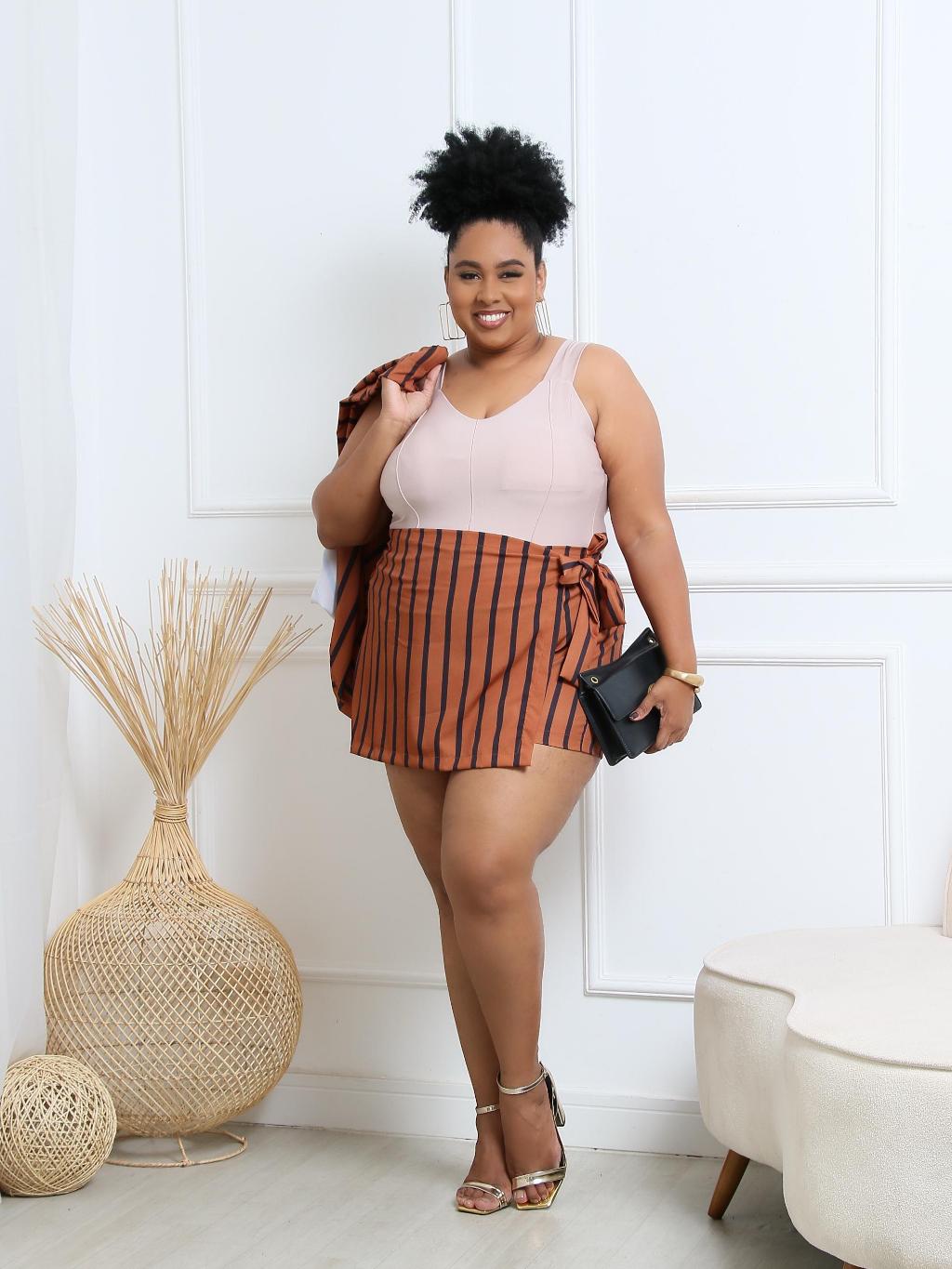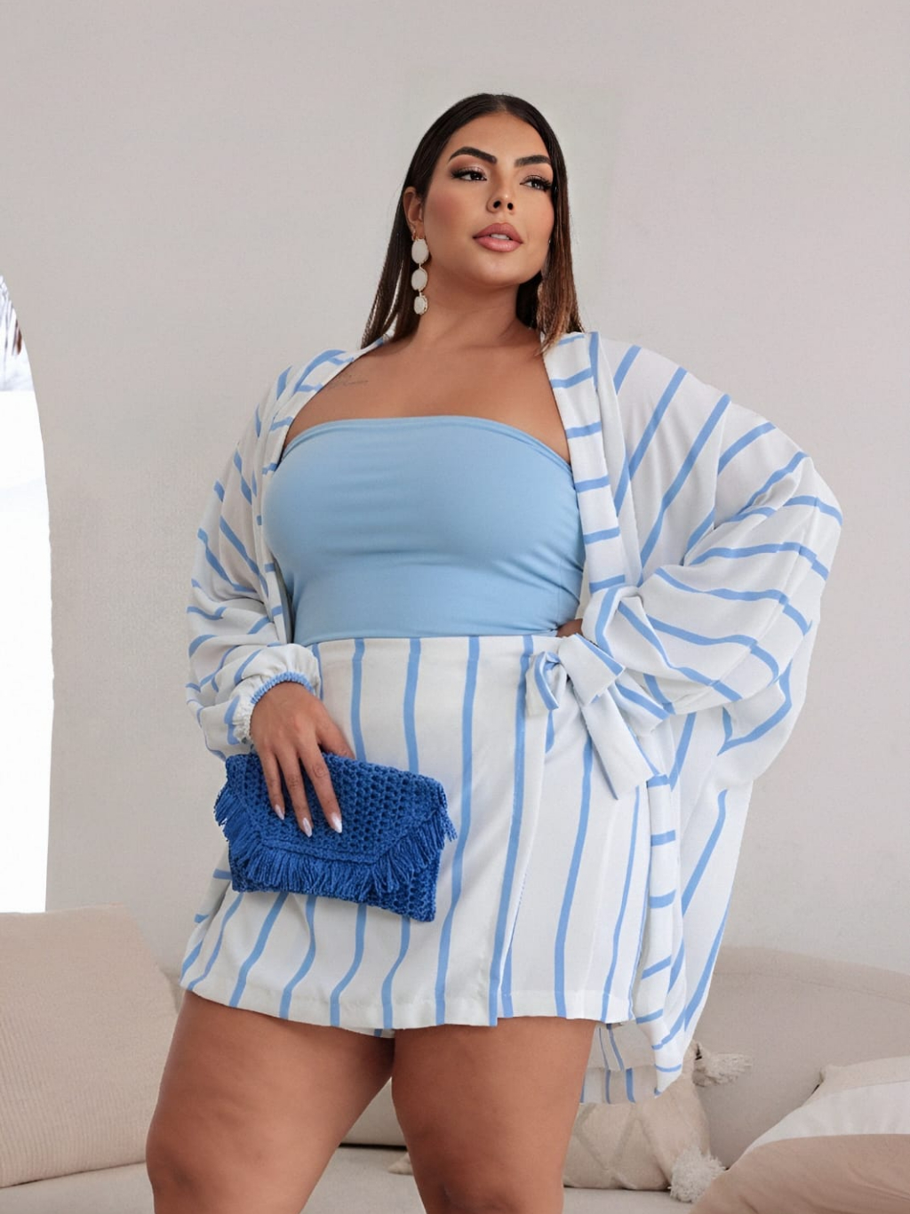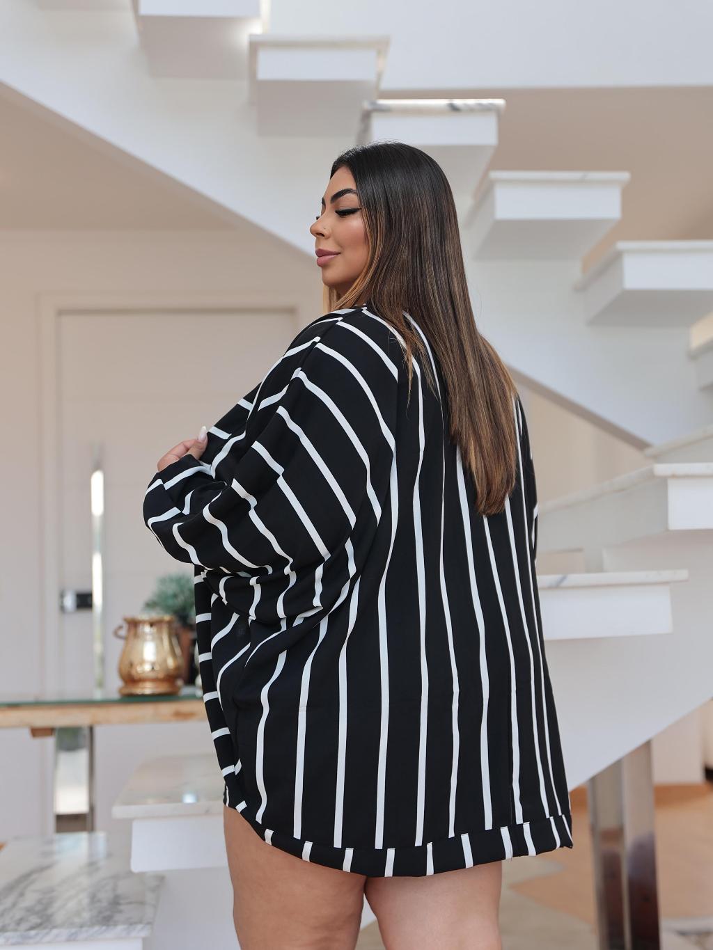 Conjunto Femenino Plus Size Listrado Kimono e Short Saia Moda Blogueira e Gringa com Elastex Cintura Listrado Lançamento