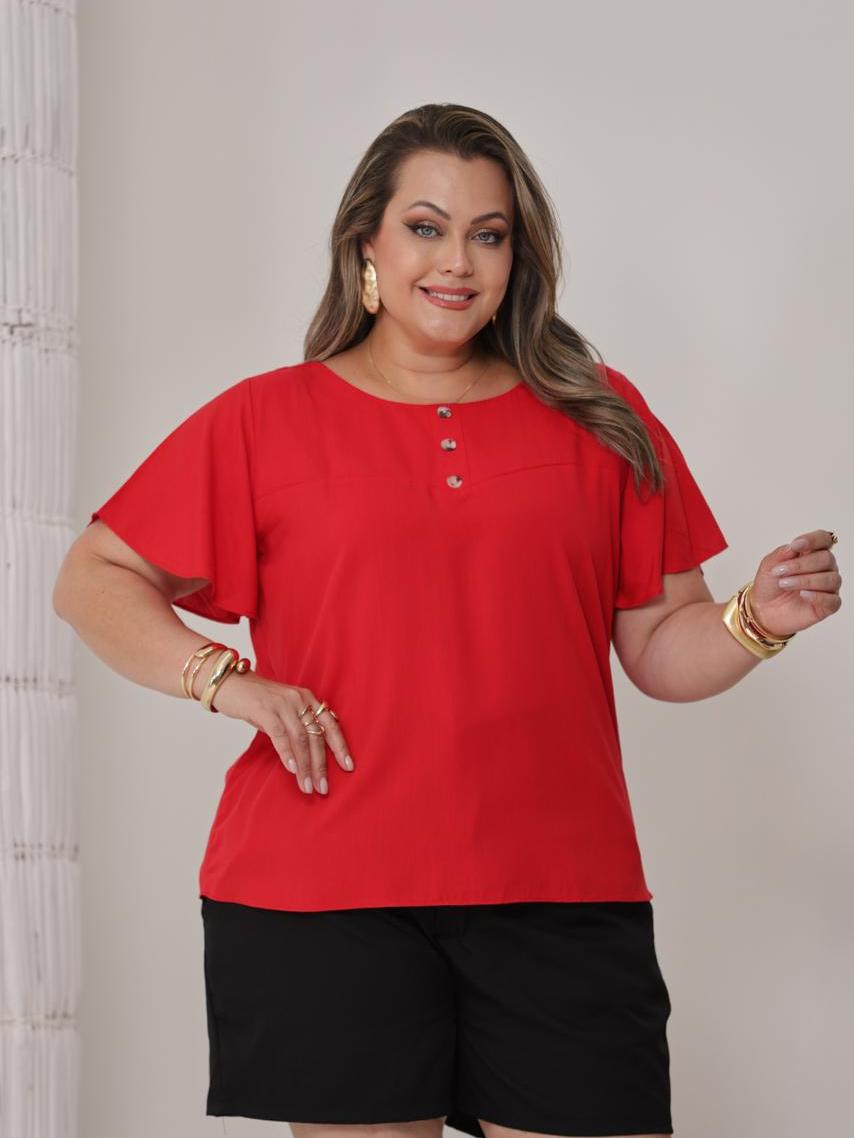 Blusa Viscolinho Plus Size Feminina Manga Soltinha com Botões Decorativos na Frente GG ao G3