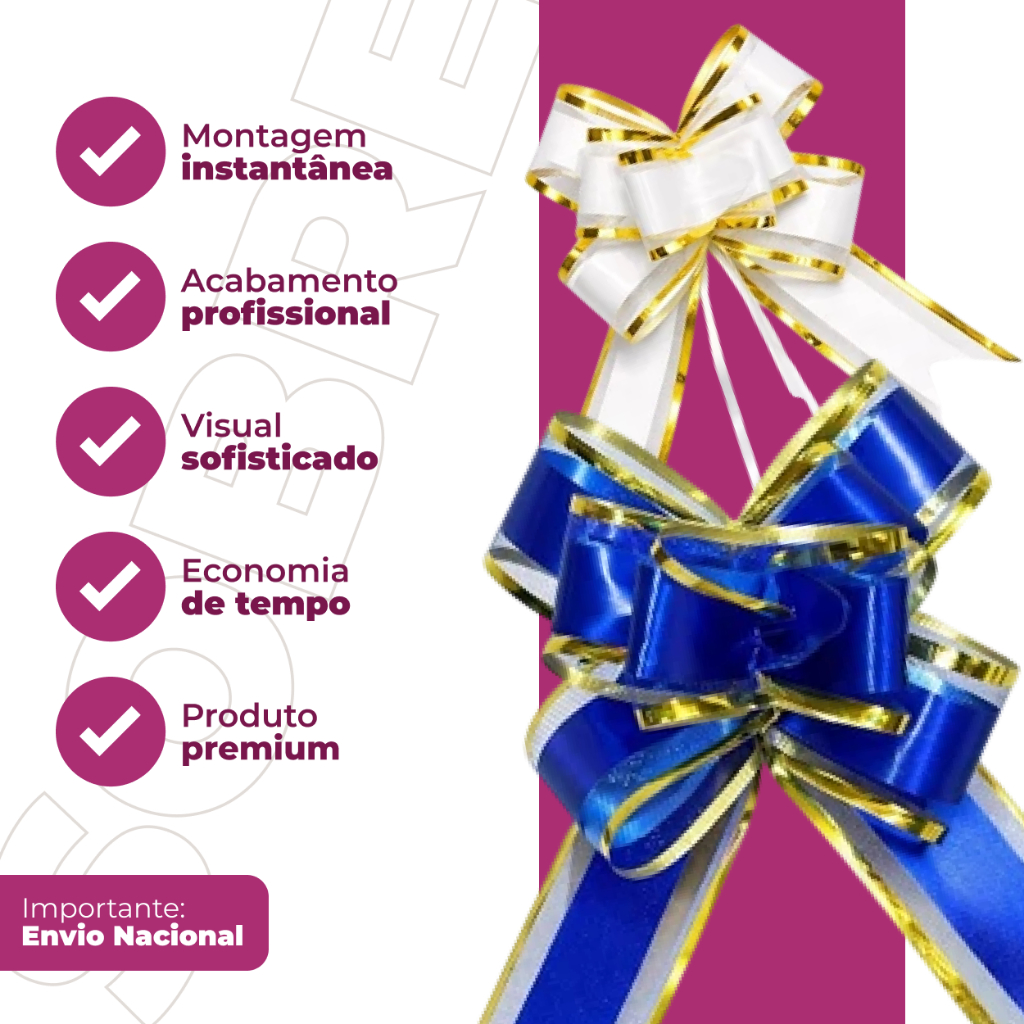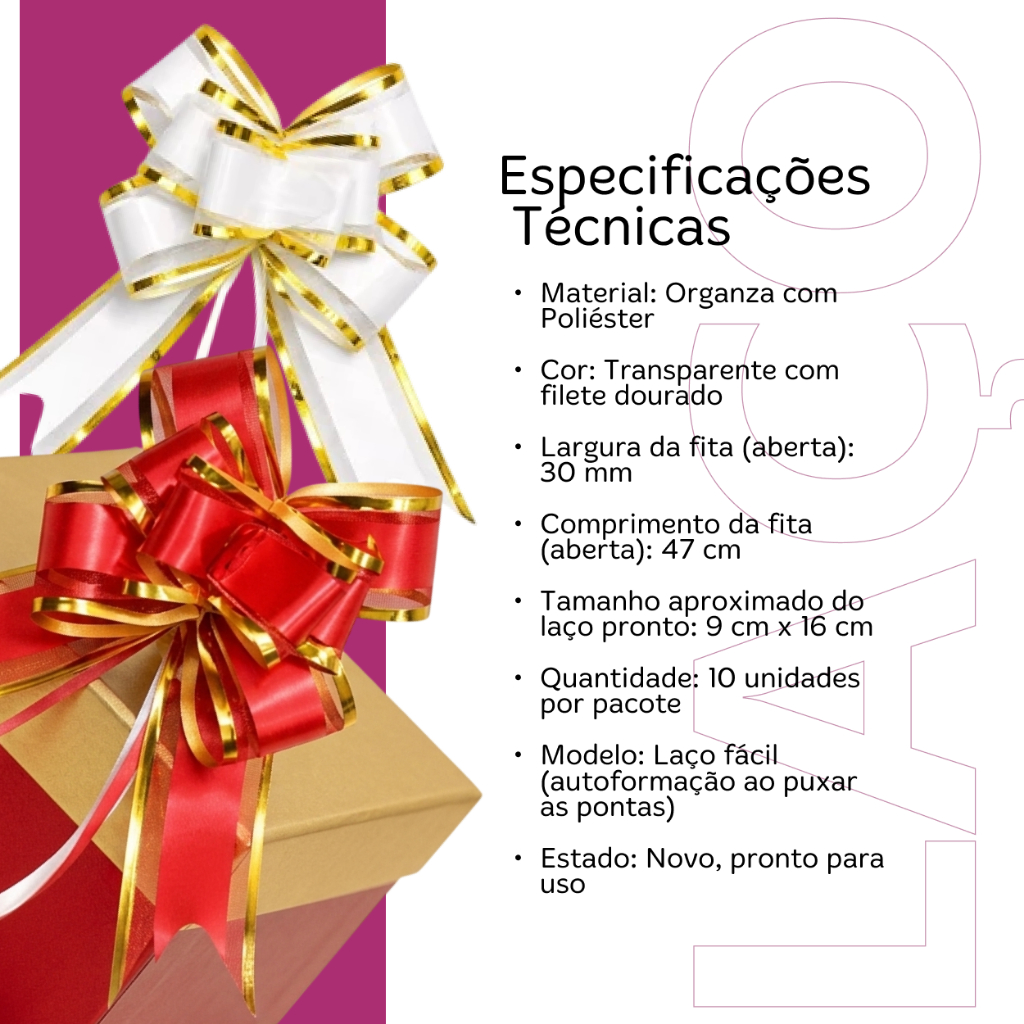 Kit 50 Laço Fácil Organza com Poliéster 30mm x 47cm Para Presente Mega Luxo