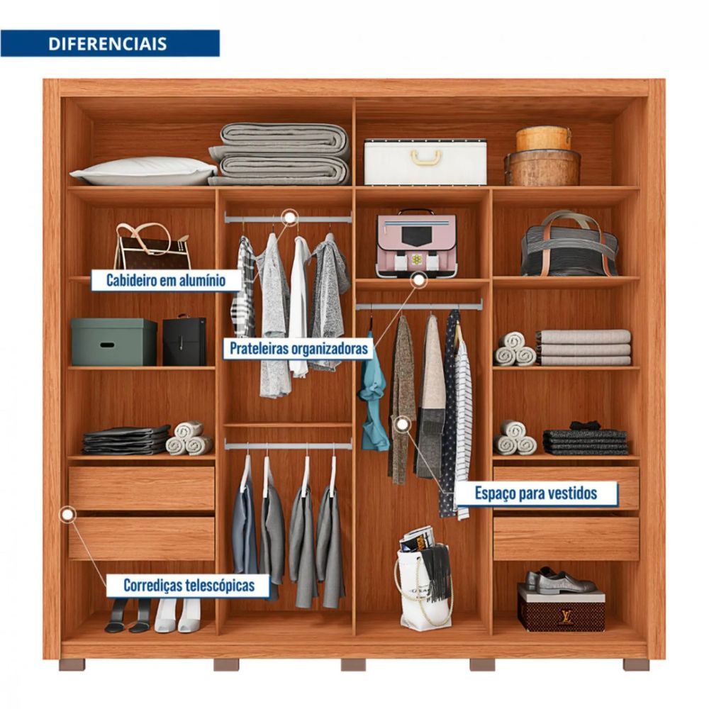 Guarda-Roupa Casal 2 Portas de Correr 4 Gavetas e Espelho 100% MDF Montagem Flex Moviment Caemmun