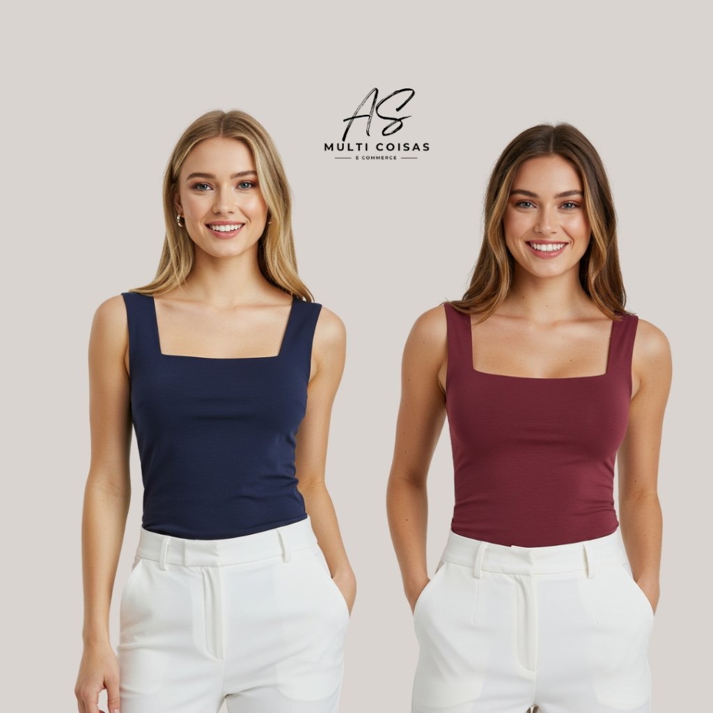 KIT COM 2 REGATAS ALÇA LARGA COM FORRO DUPLO FRONTAL DECOTE QUADRADO NO TECIDO SUPLEX FACULDADE VERÃO