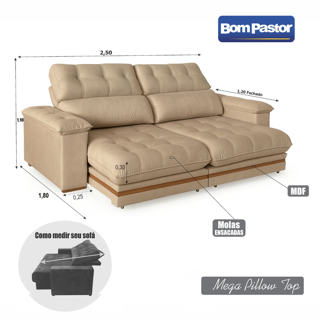 Sofá 4 Lugares 2,50m Retrátil e Reclinável Turim Bom Pastor