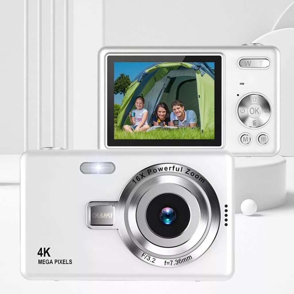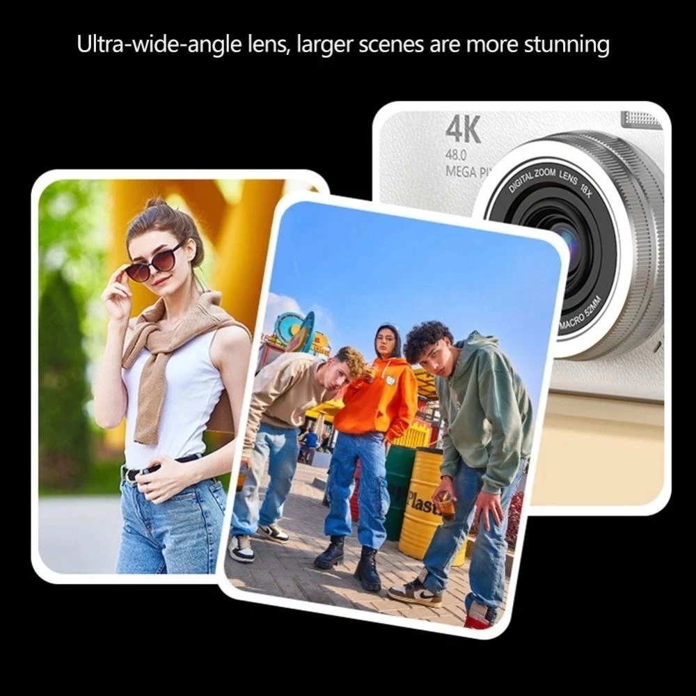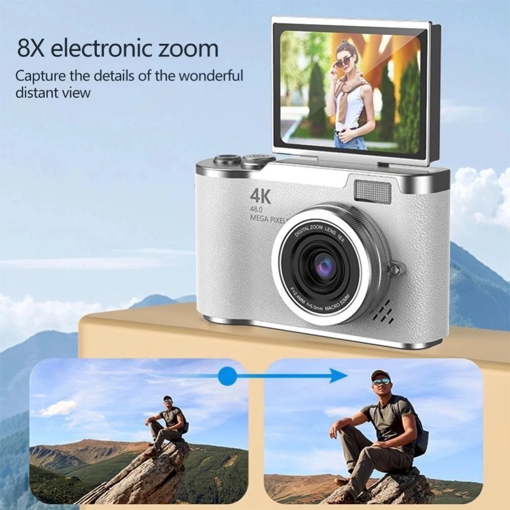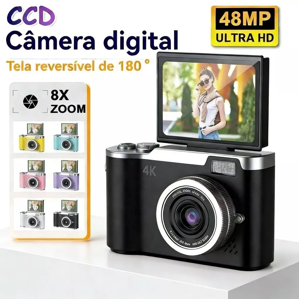 Câmera digital com zoom 4K CCD 8x, adequada para fotografia estudantil, compacta de 48MP, tela flip selfie de 180°