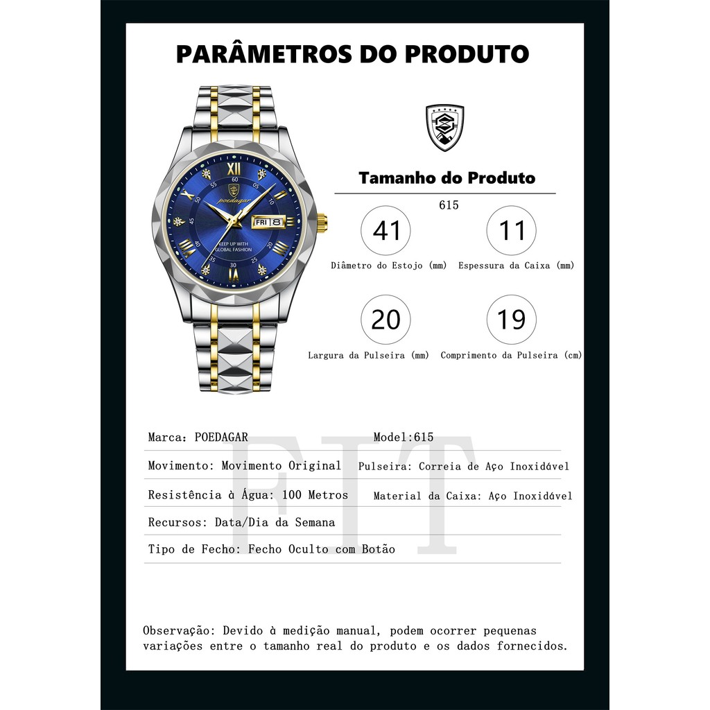 【Local do Brasil】Marca de Luxo POEDAGAR 615 Relógio de Quartzo Relógio Casual Relógio Masculino Prova D'água 924 930