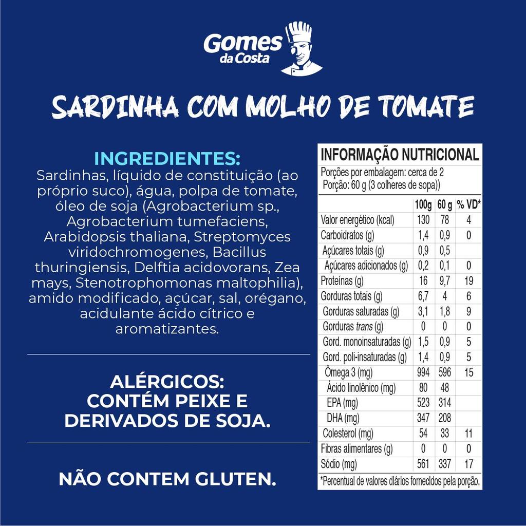 Kit 3 Un - Sardinhas ao Próprio Suco com Molho de Tomate Temperado - 125g - Gomes da Costa