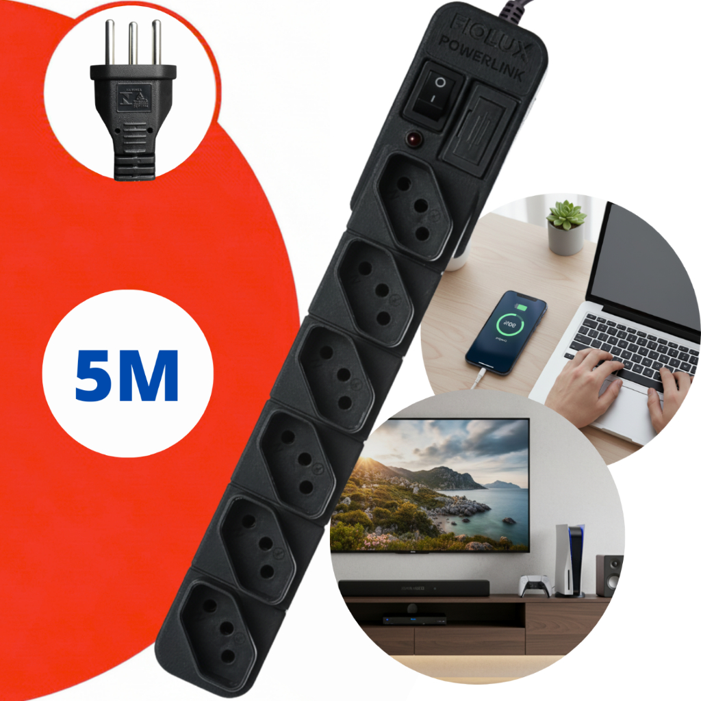 Extensão Régua Filtro De Linha 127 220 Protetor Energia Elétrica Com Fusível Bivolt 6 Tomadas Fiolux