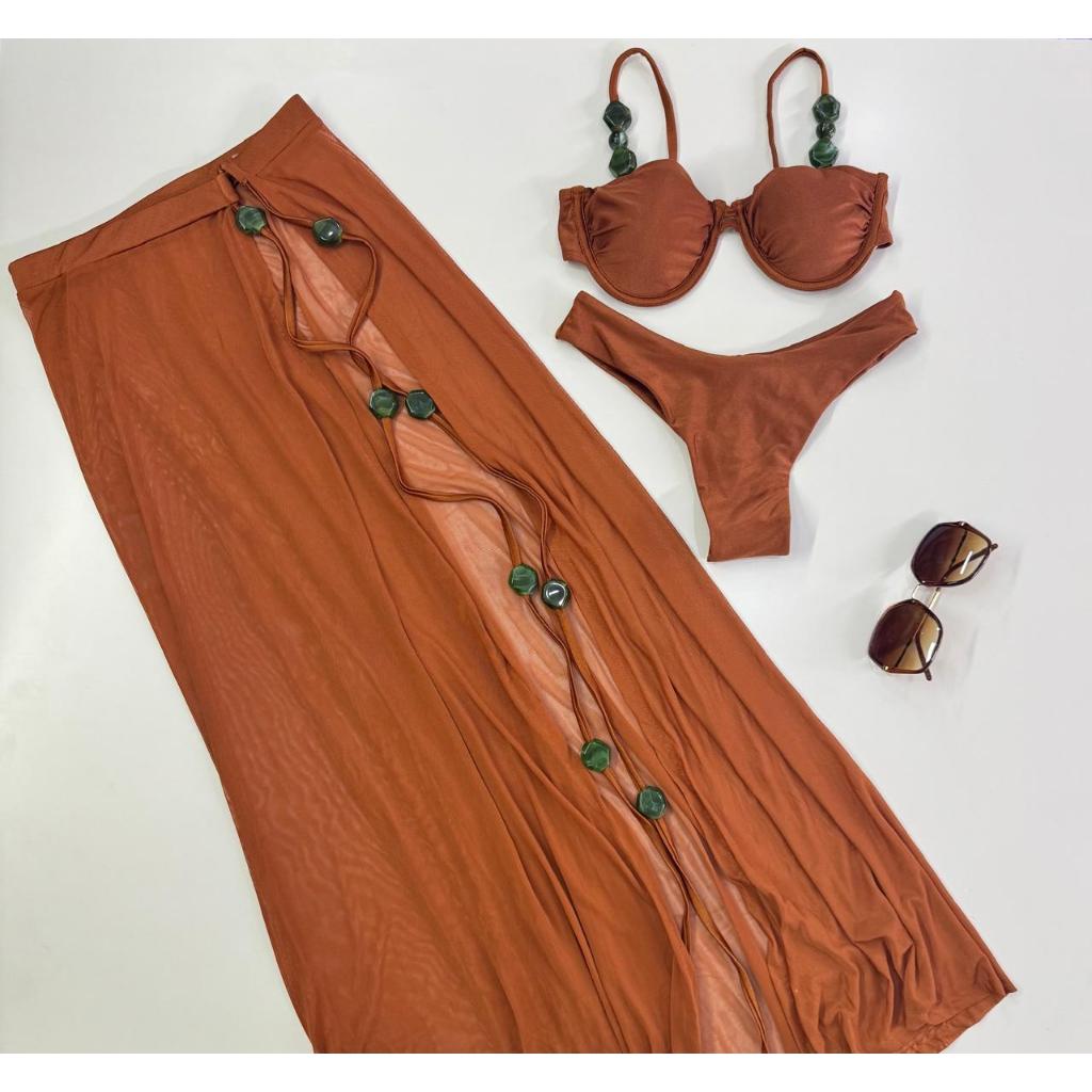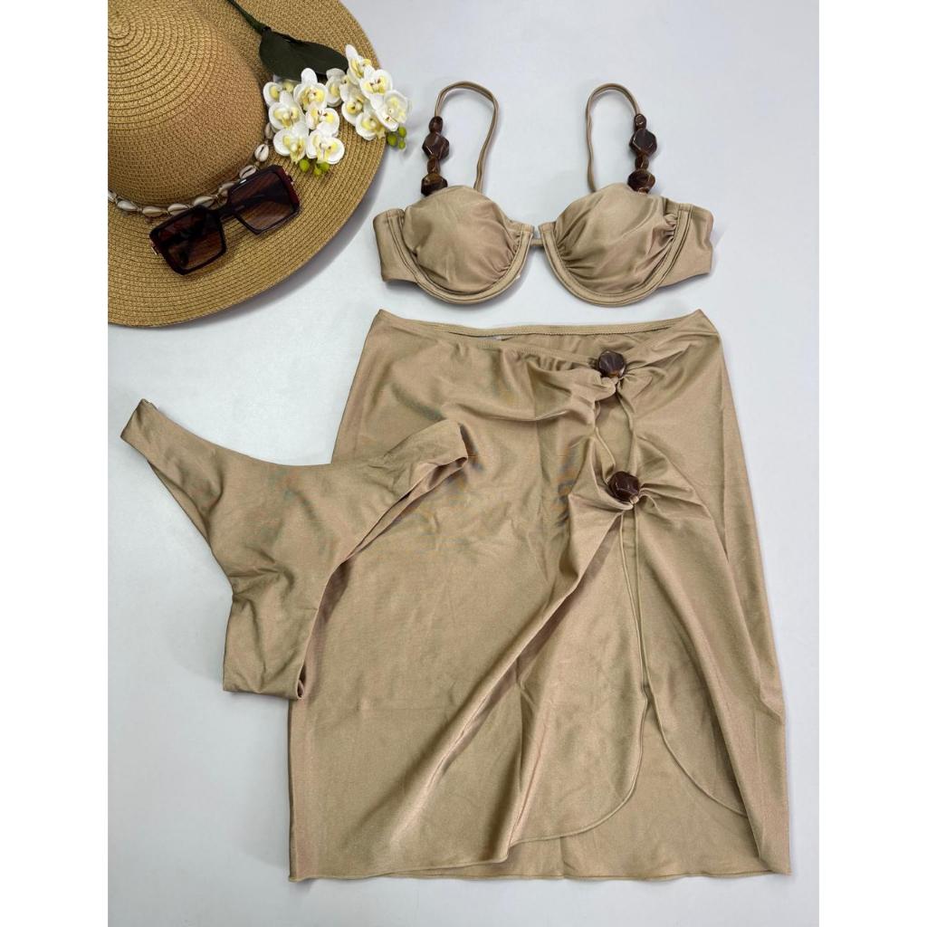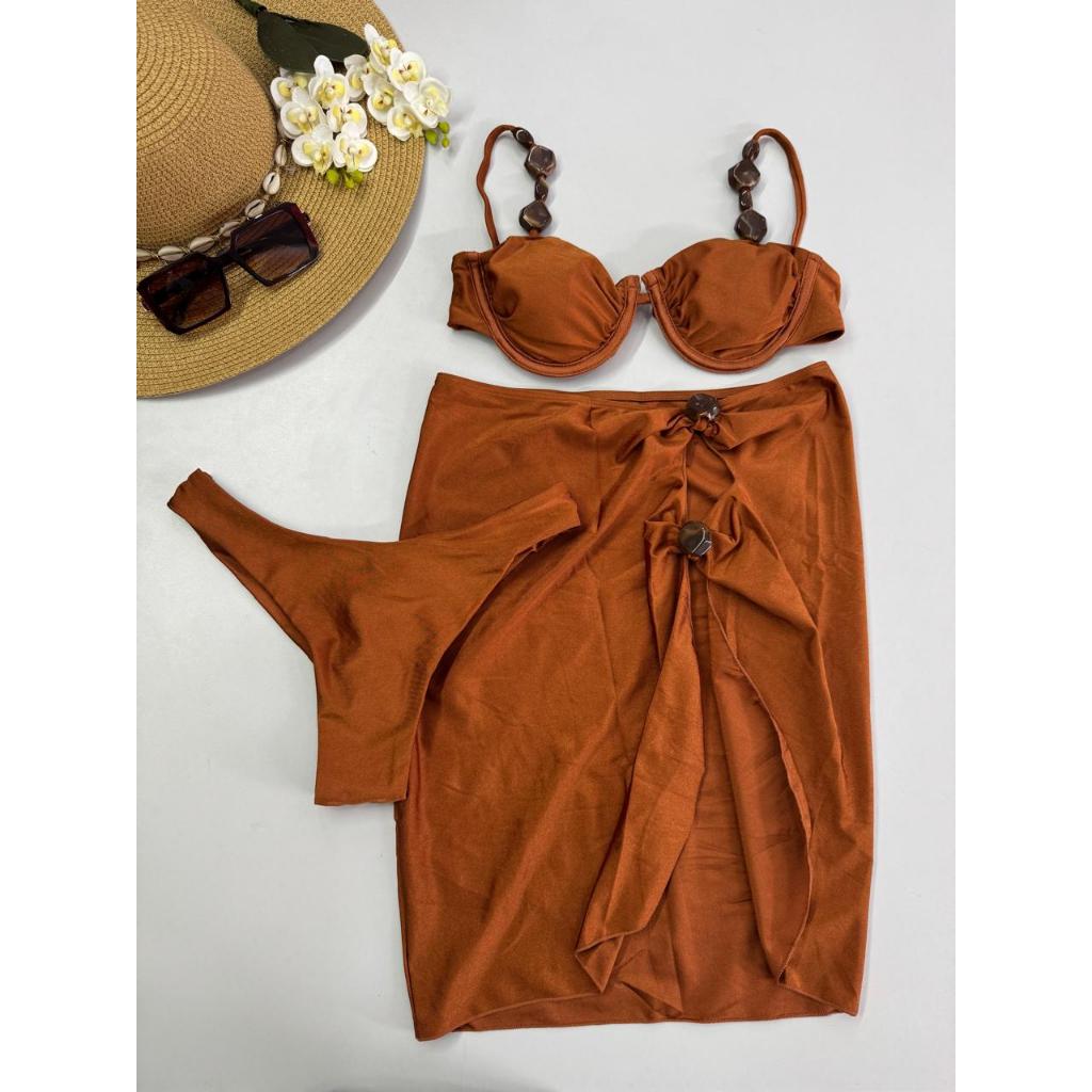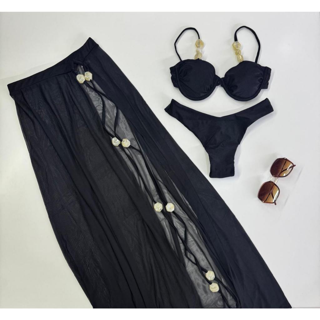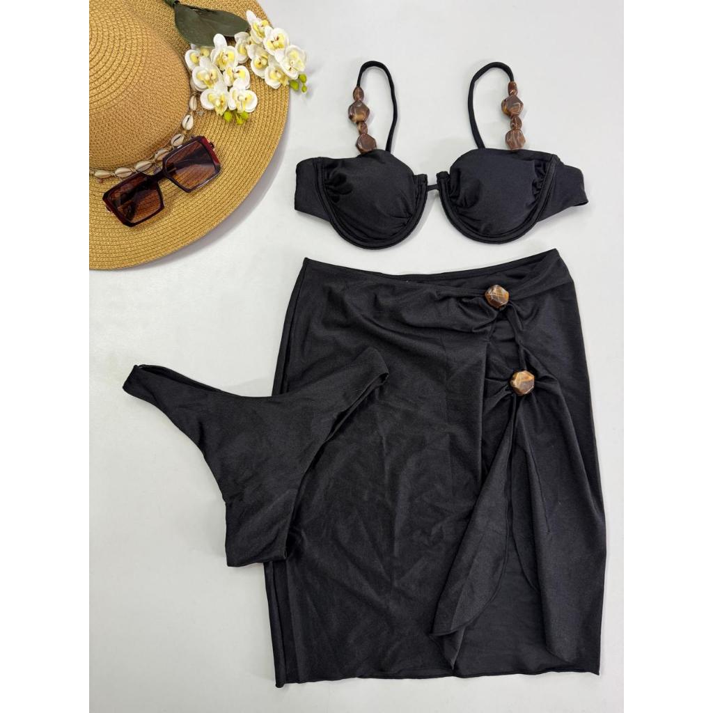 Biquíni 3 Peças com Saída de Praia – Bojo Removível, Alças Reguláveis, Fio Duplo e Detalhes Modernos – P M G GG
