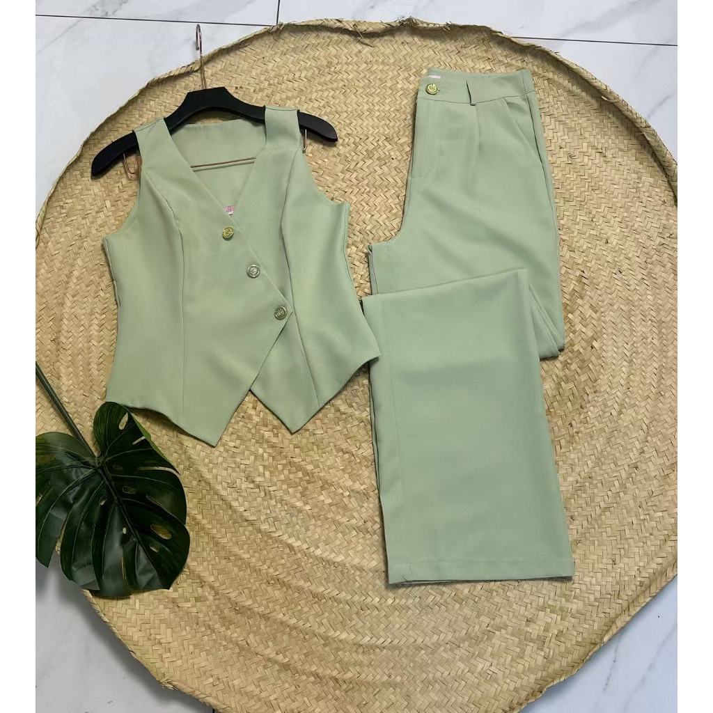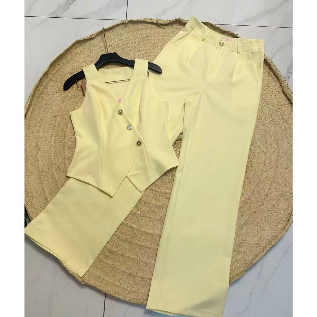 YAN FASHION Conjunto Colete Alfaiataria V Neck Botões Dourados e Calça Feminina Elegante