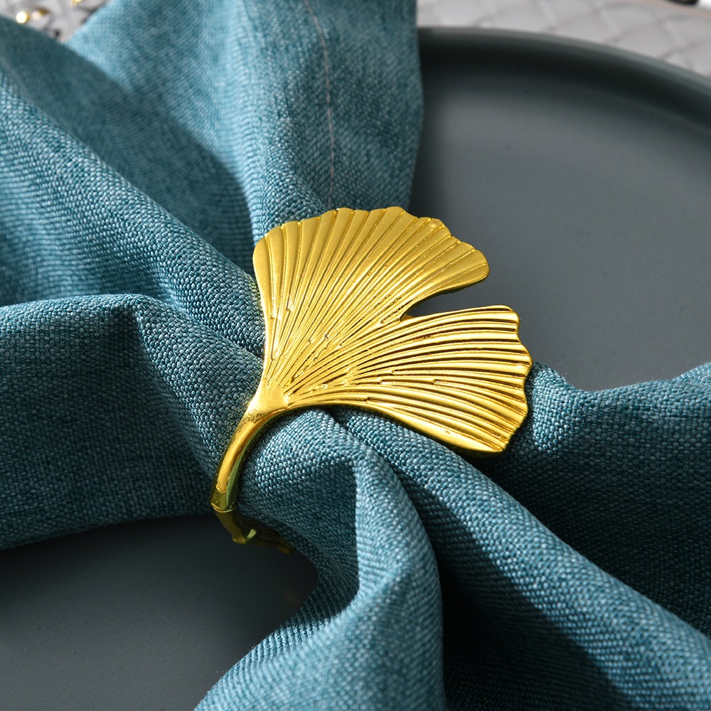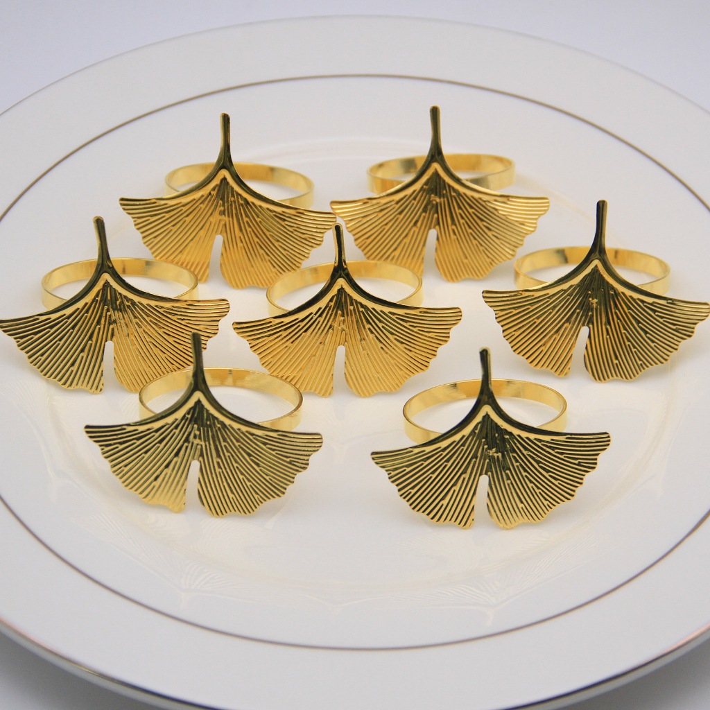 Kit 6 argolas para guardanapos com folhas de ginkgo douradas - material de metal de alta qualidade。