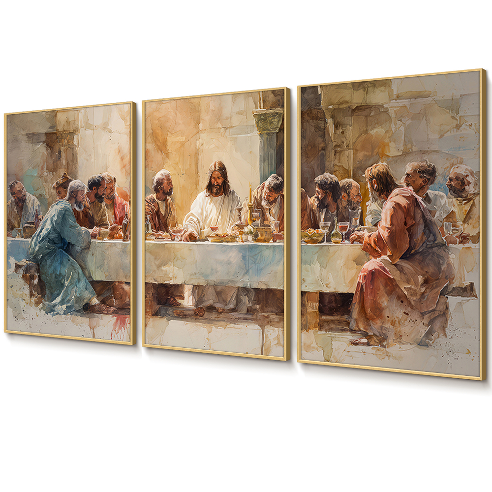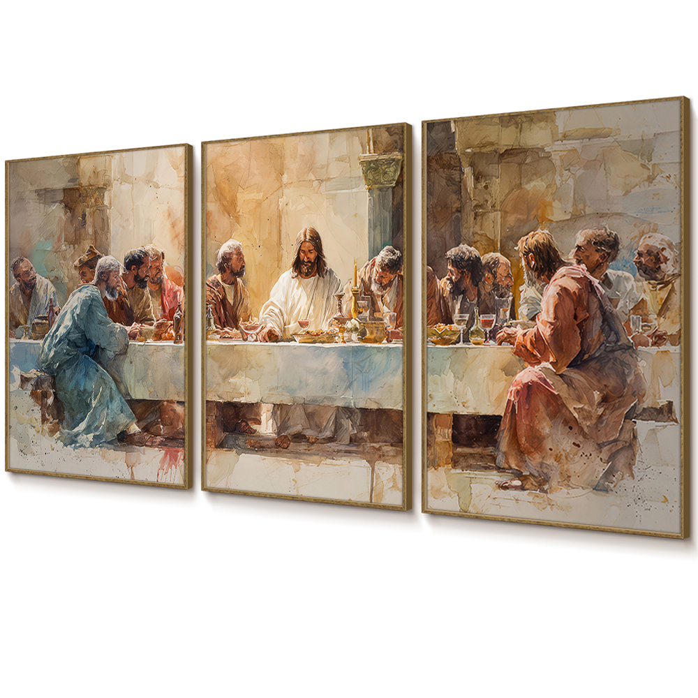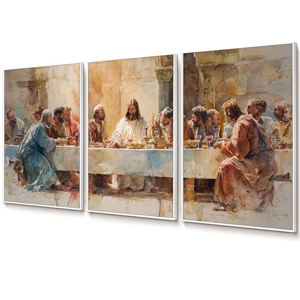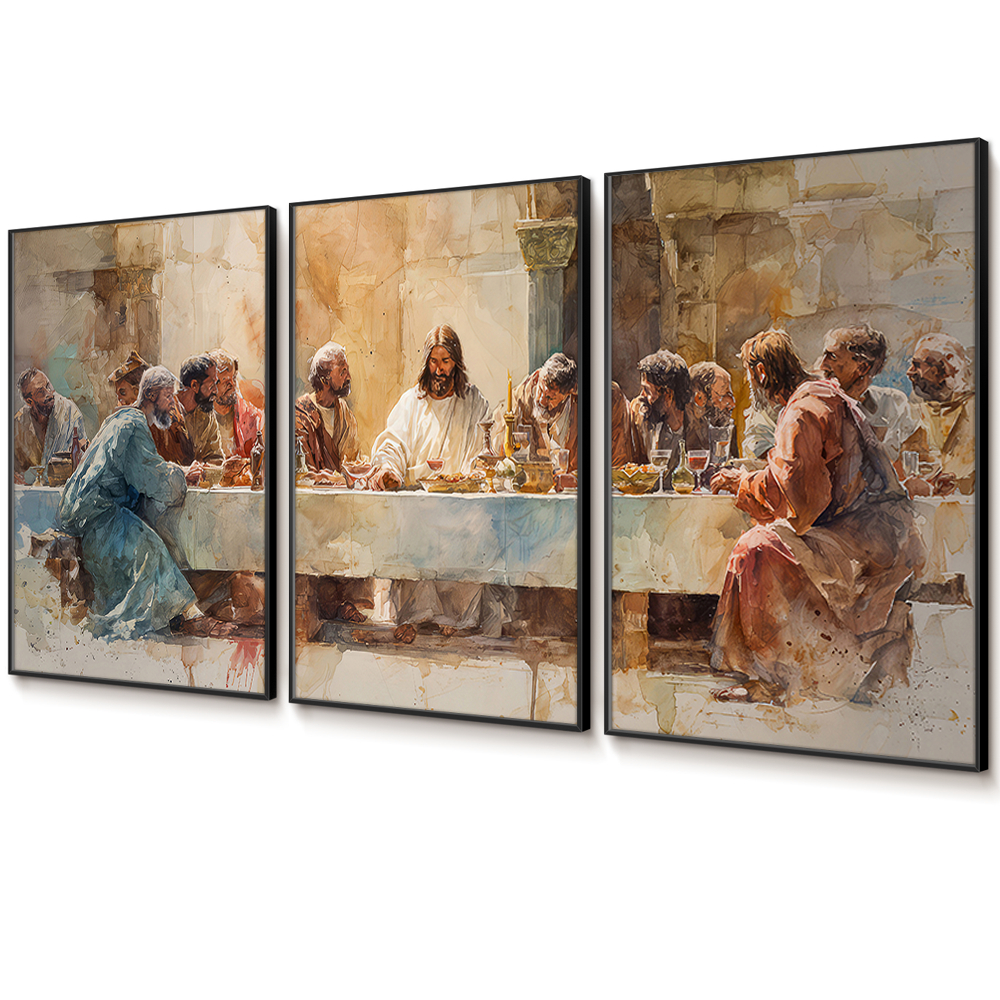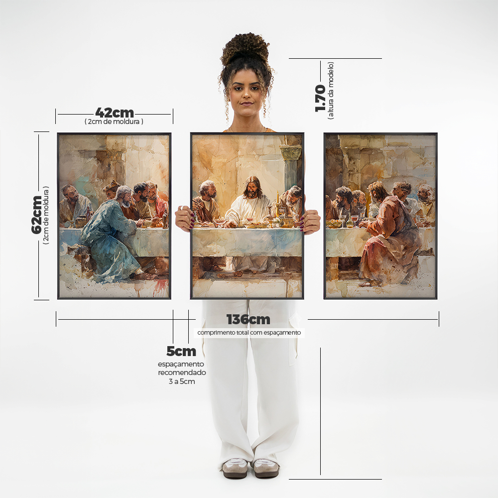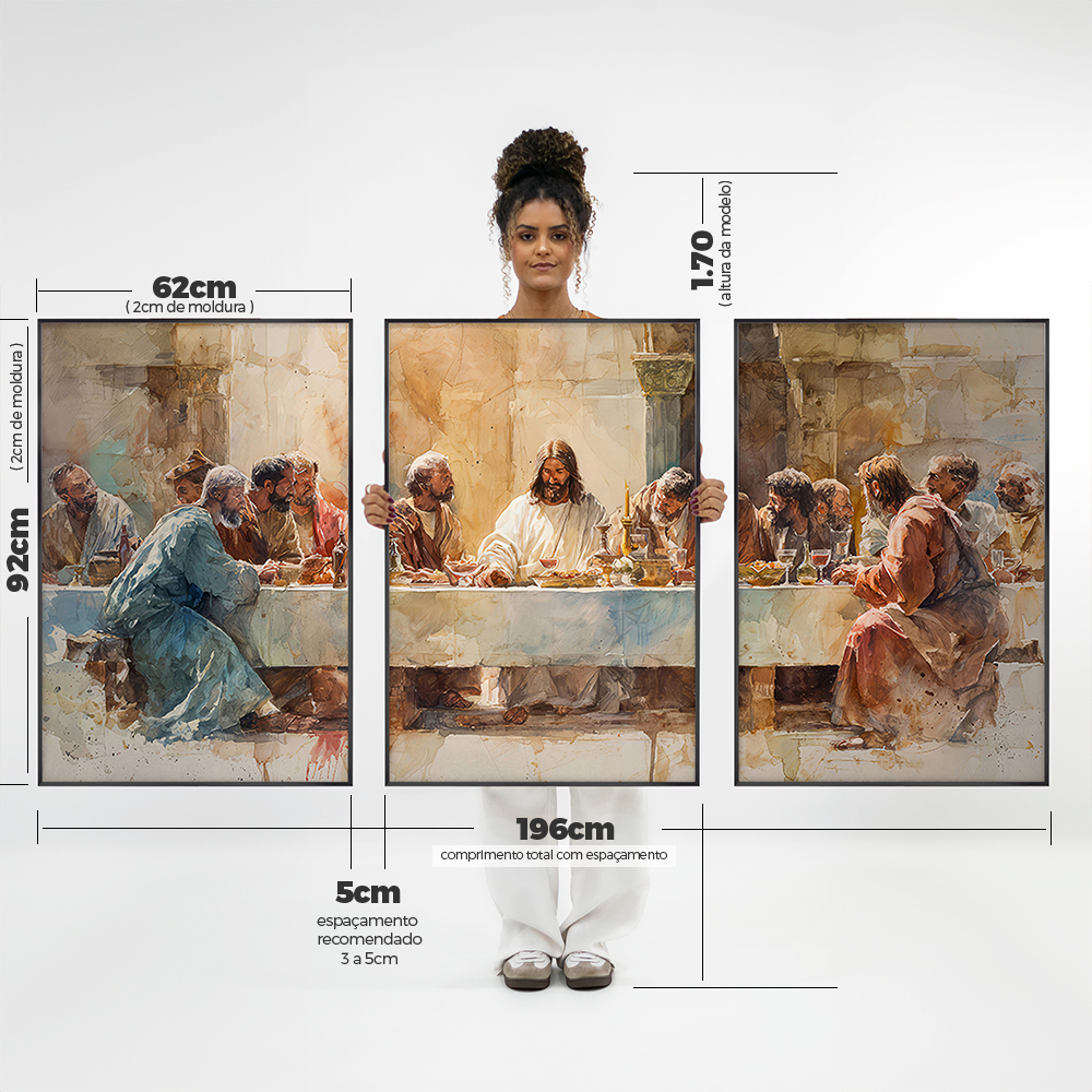 Quadro Decorativo Religioso Santa Ceia Aquarela Sala Quarto Escritório Trio Com Moldura Filete Vidro