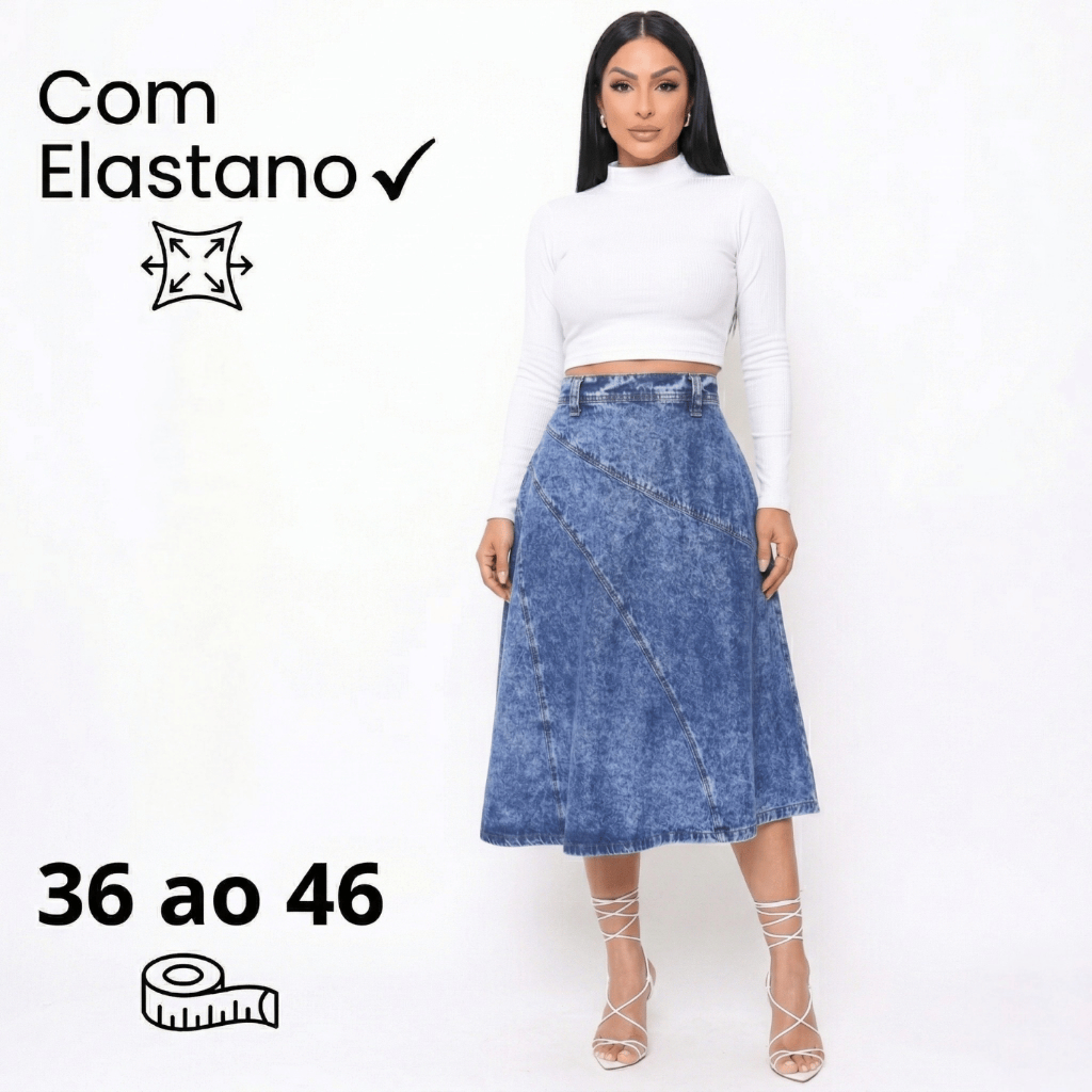 Saia Jeans Longa Feminina Evangélica Cintura Alta Com Elastano Godê Moda Cristã Midi Elegante