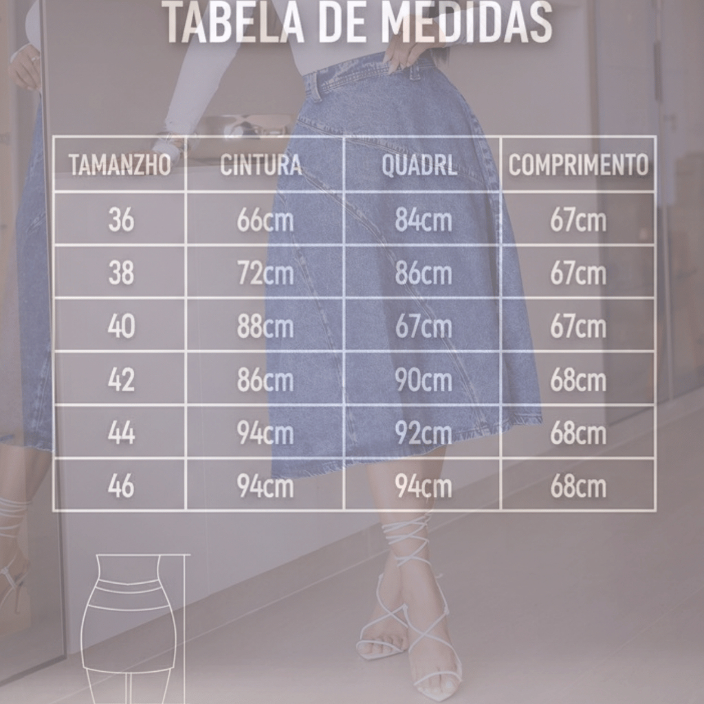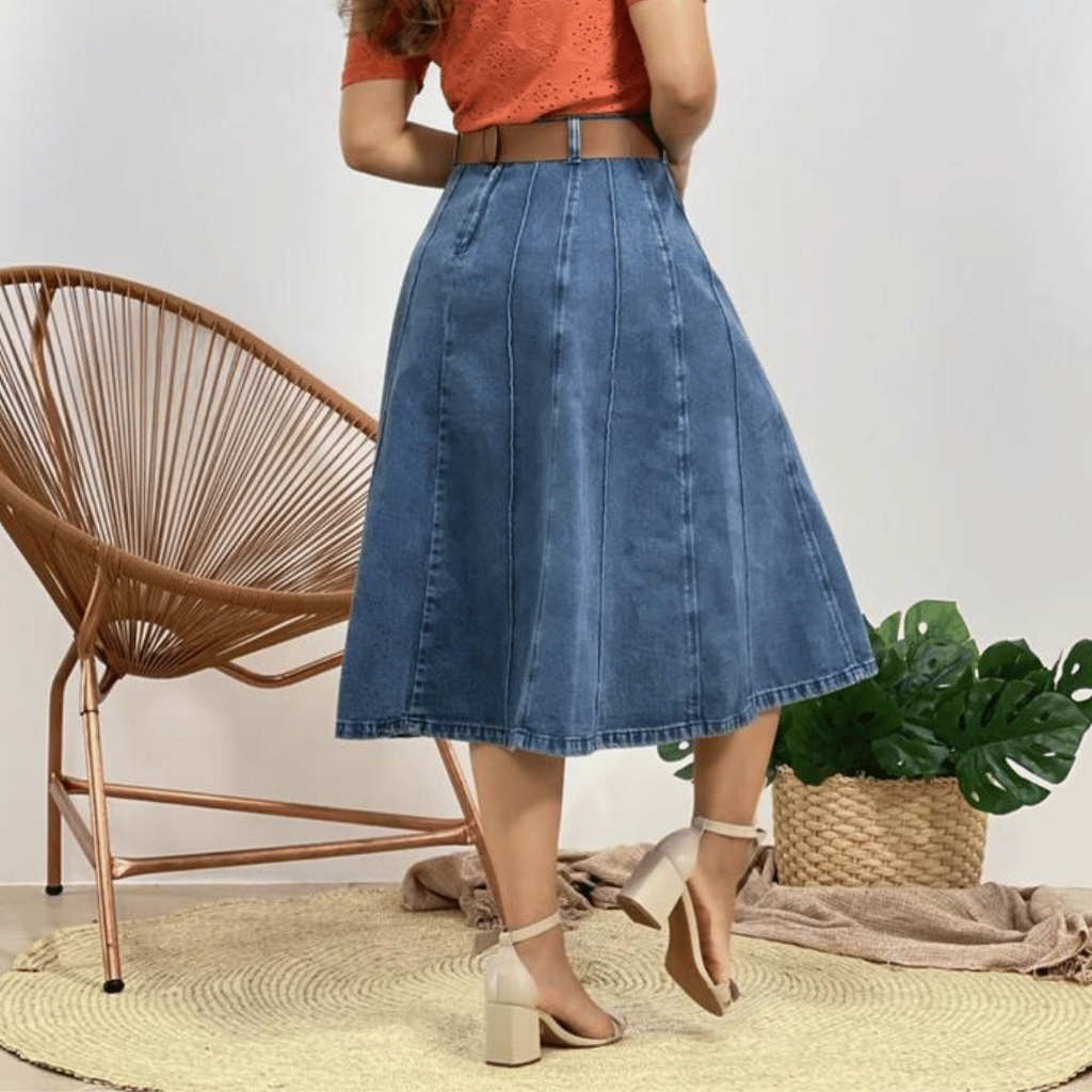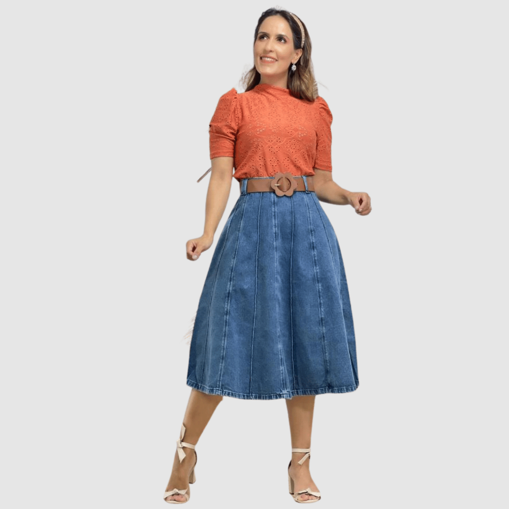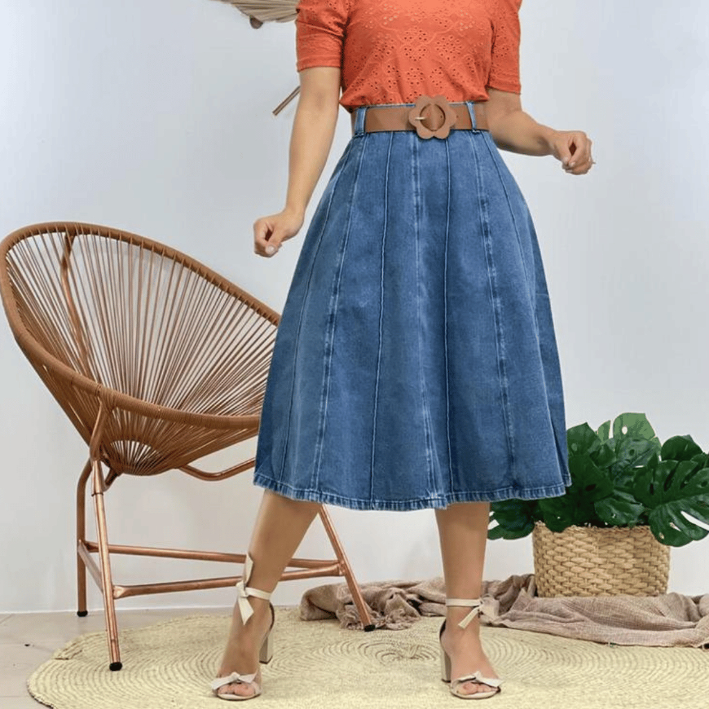 Saia Jeans Feminina Rodada Midi Elegante Premium 100% Algodão Moda Evangélica Modeladora