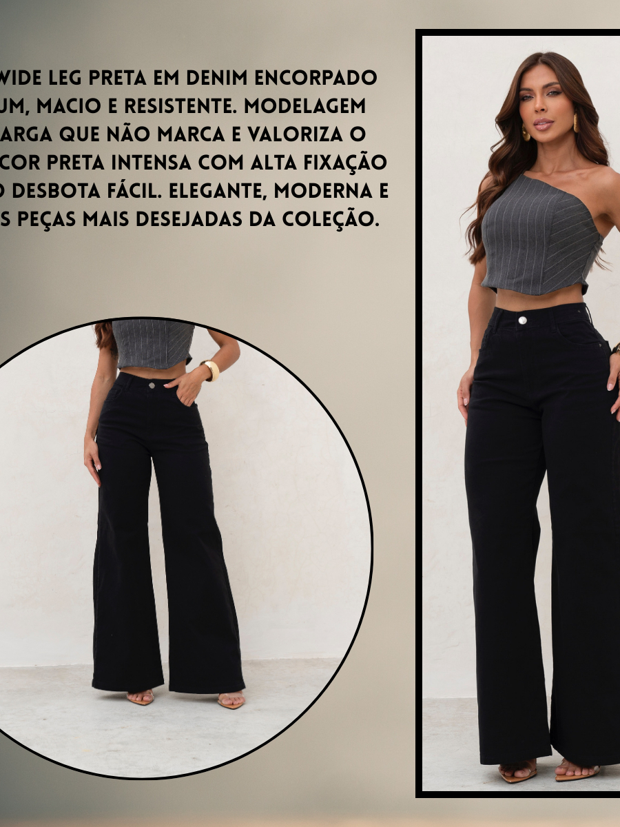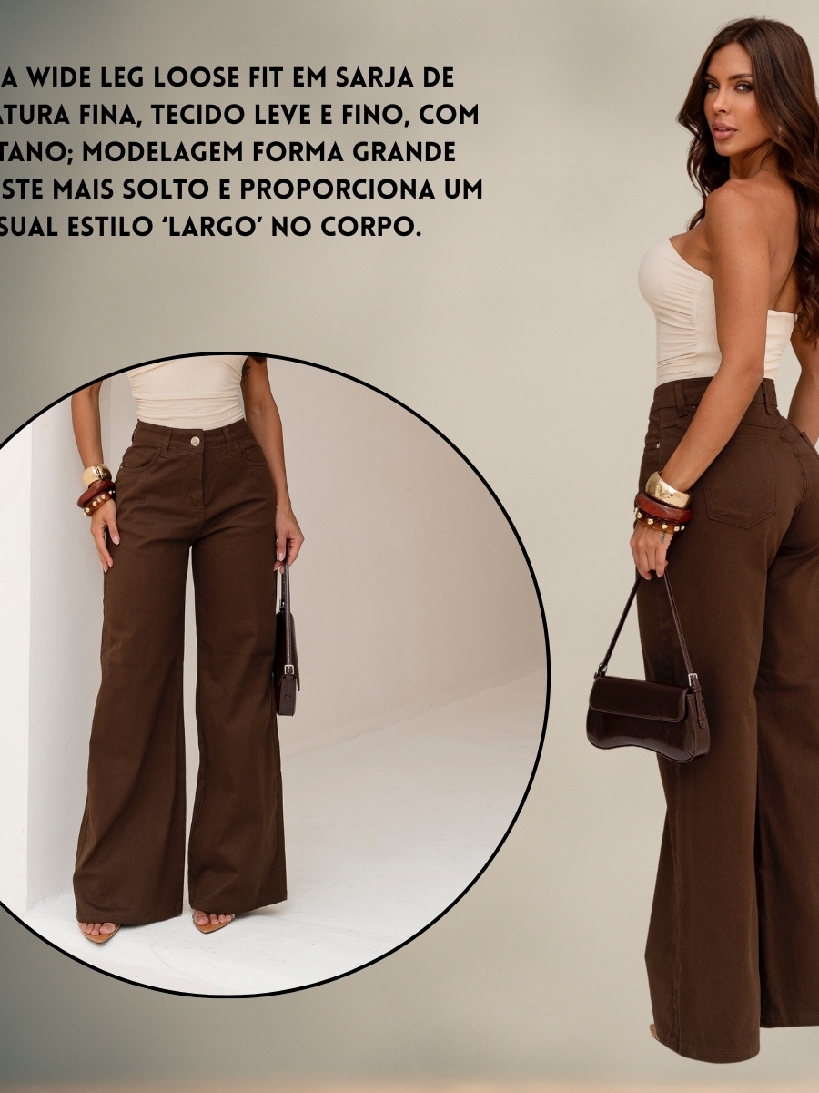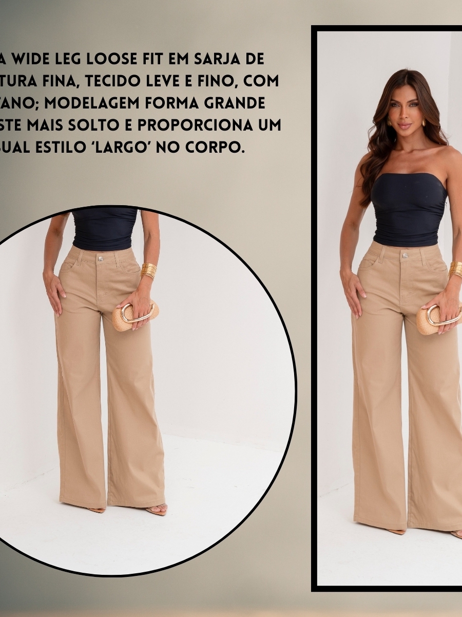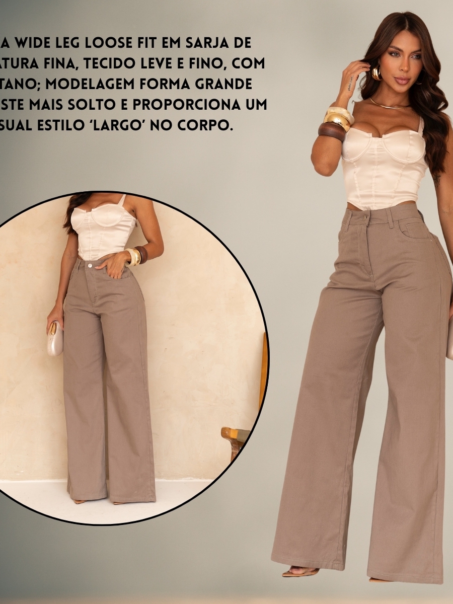 Calça Wide Leg Feminina Sarja Cintura Alta Alfaiataria Conforto Elastano