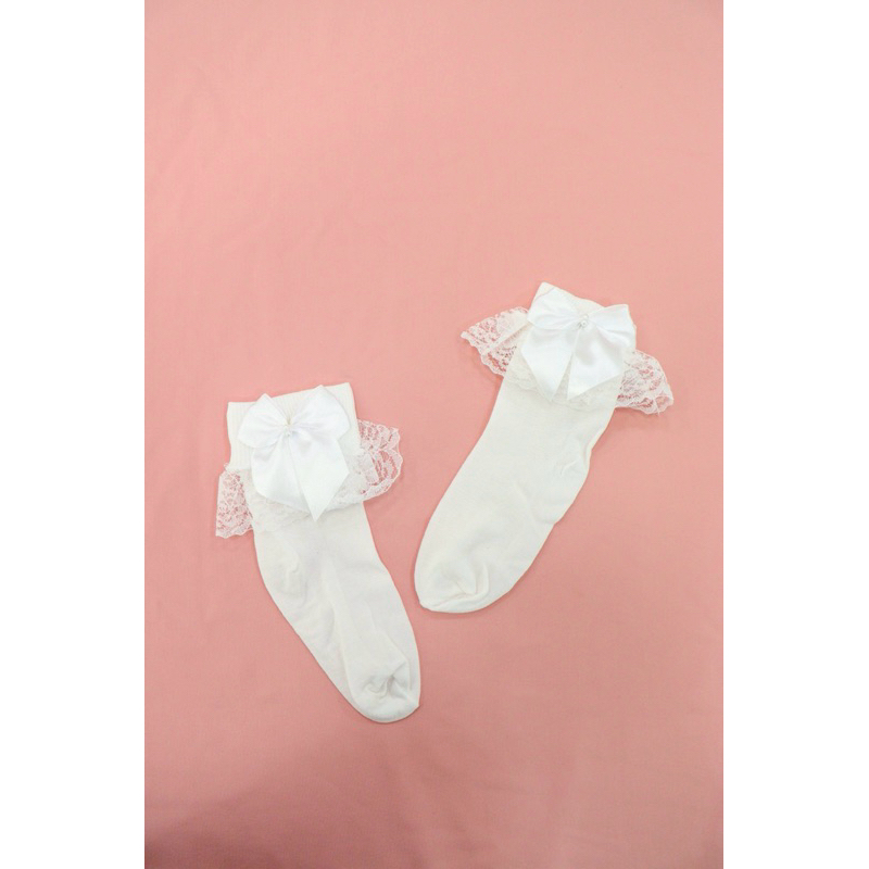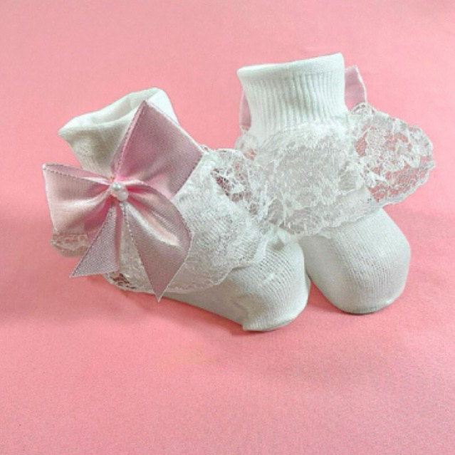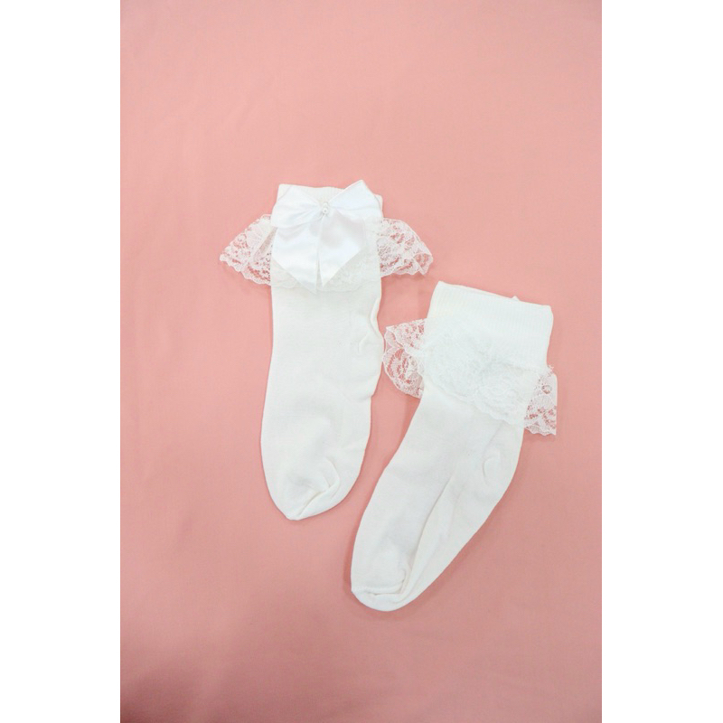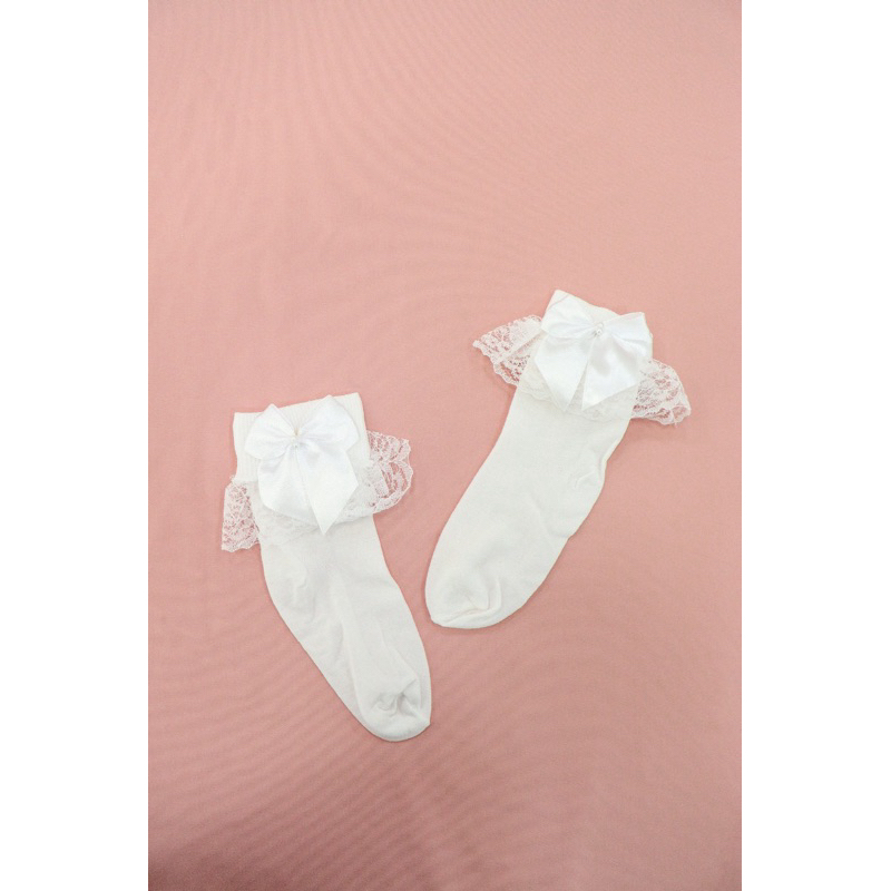 Meia infantil renda e laço grande cano médio bebê social batizado festa menina luxo elegante