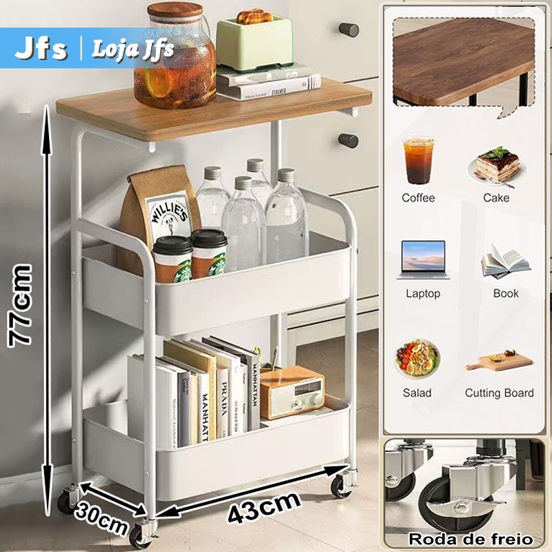Carrinho Organizador 3 Andares em Aço Carbono Painéis Espessados Organização em Camadas e Roda com Trava | Usa como Mesa