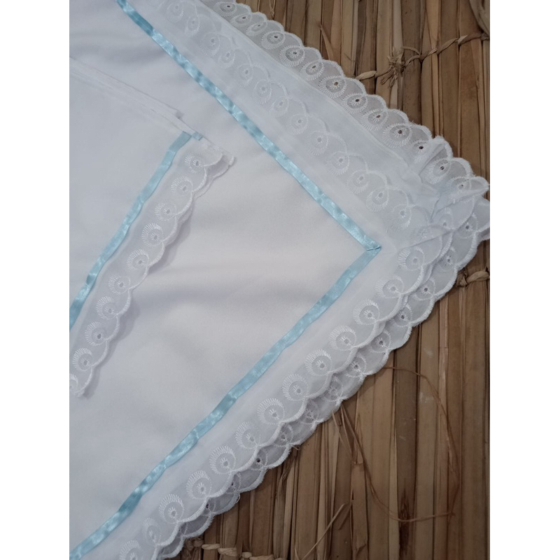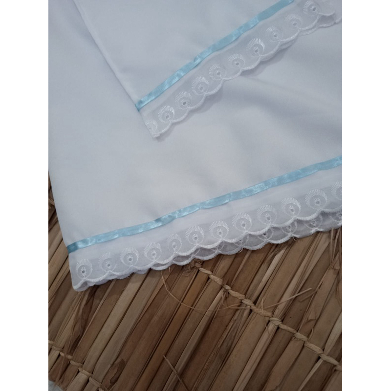 conjunto 3 peças bordado inglês branco e fita de cetim azul bebê umbanda e candomblé