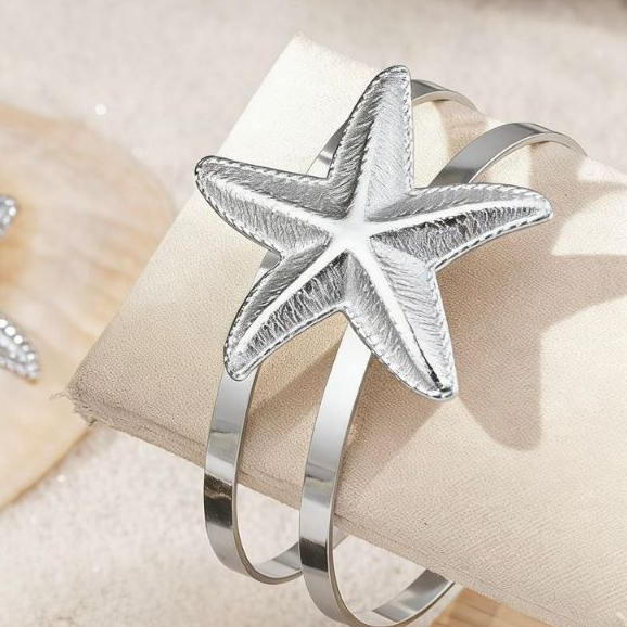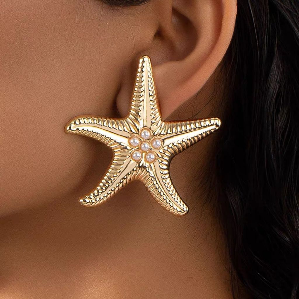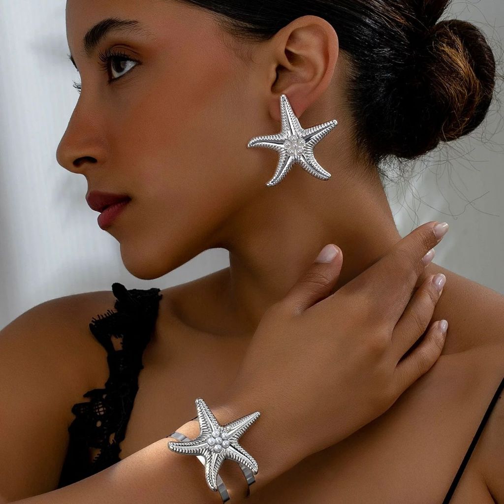 Conjunto de Joias Femininas – Brincos e Pulseira Estrela do Mar Dourada, Estilo Praia, Verão, Elegante e Fashion