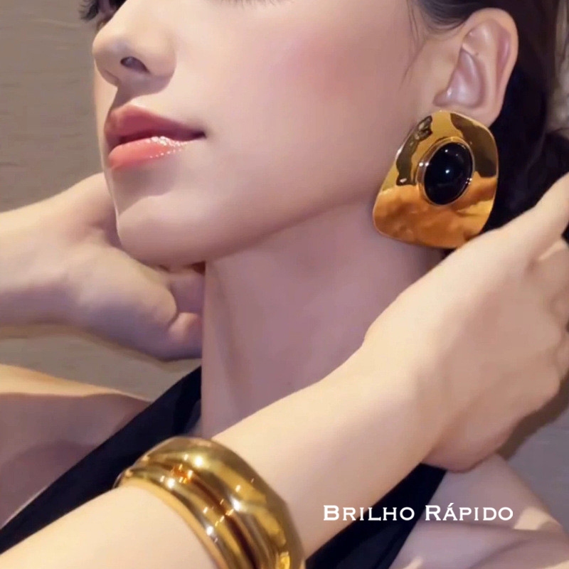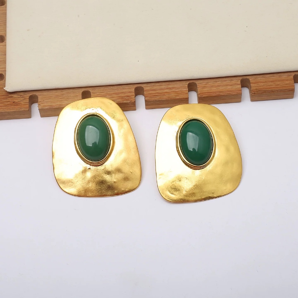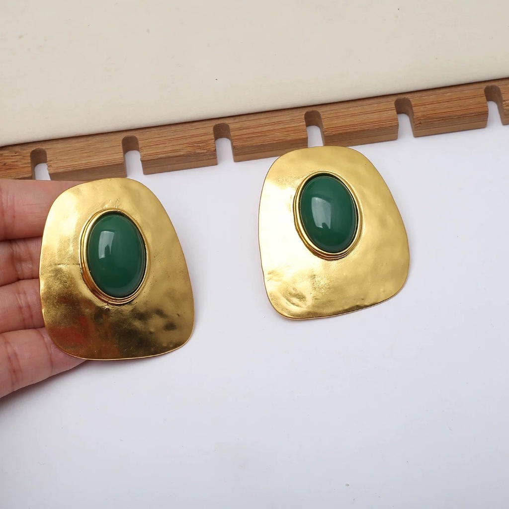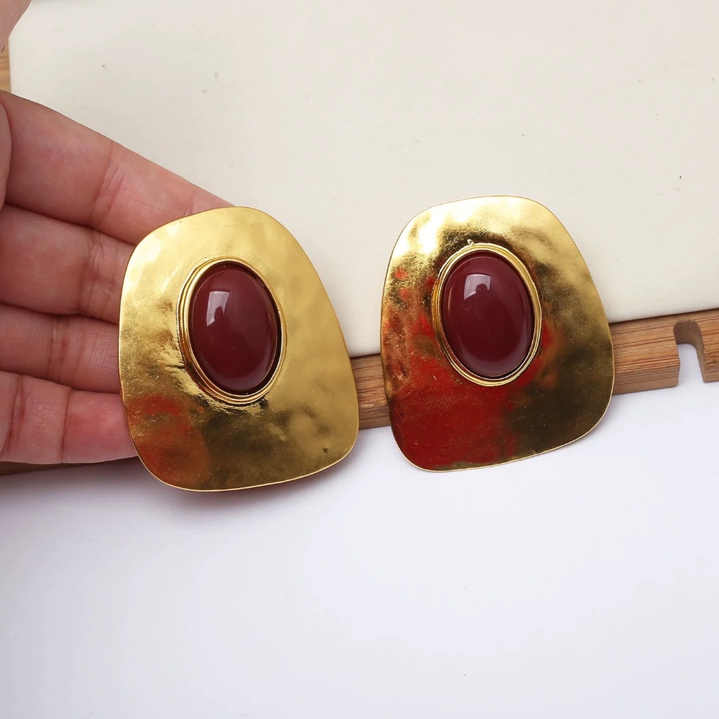 Brincos retrô: pedra cabochão banhada a ouro. Cores: vermelho, verde, preto. Luxo para jantares.