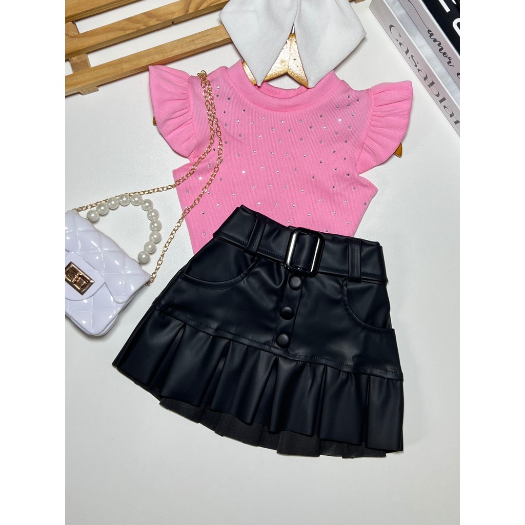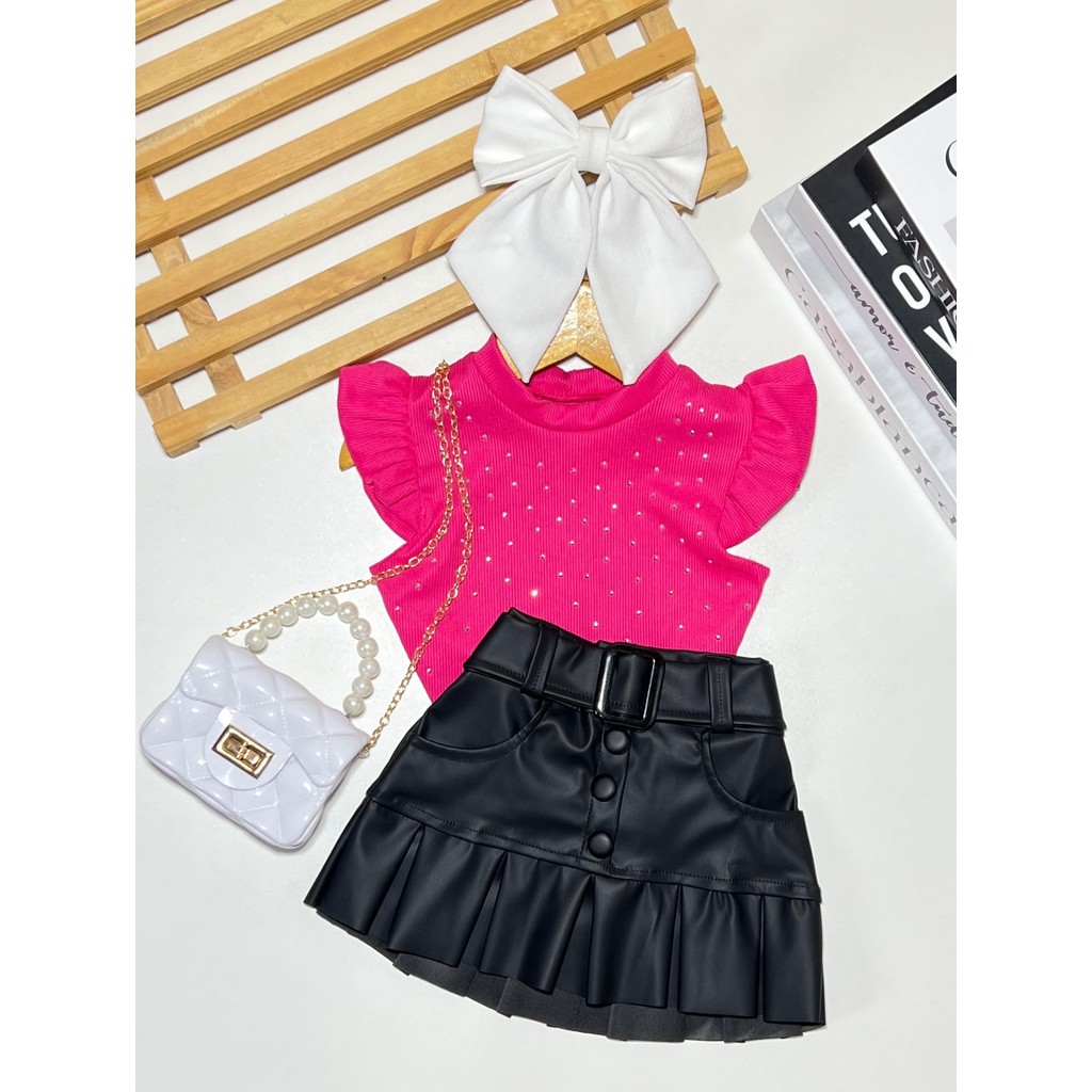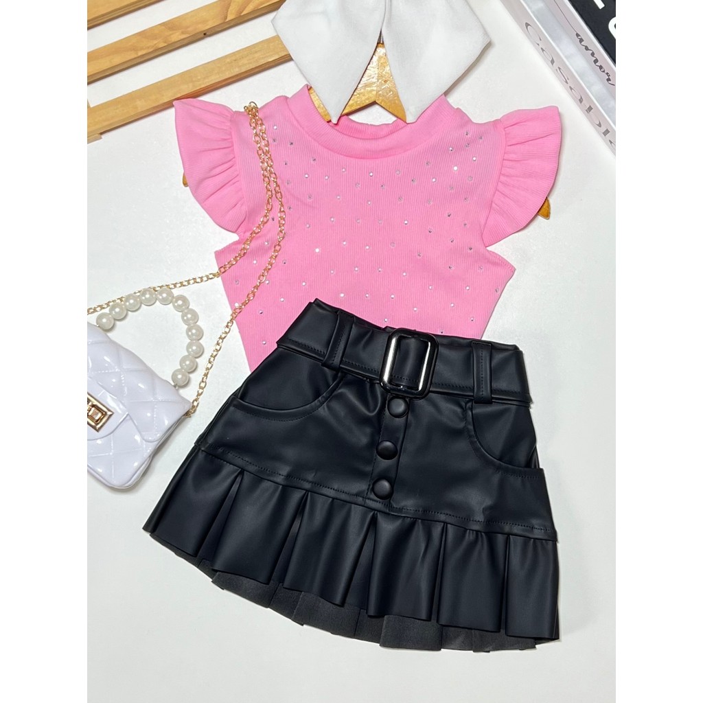 Conjunto 2 Peças Infantil Menina Saia Plissada e Blusa com Brilho Verão Passeio