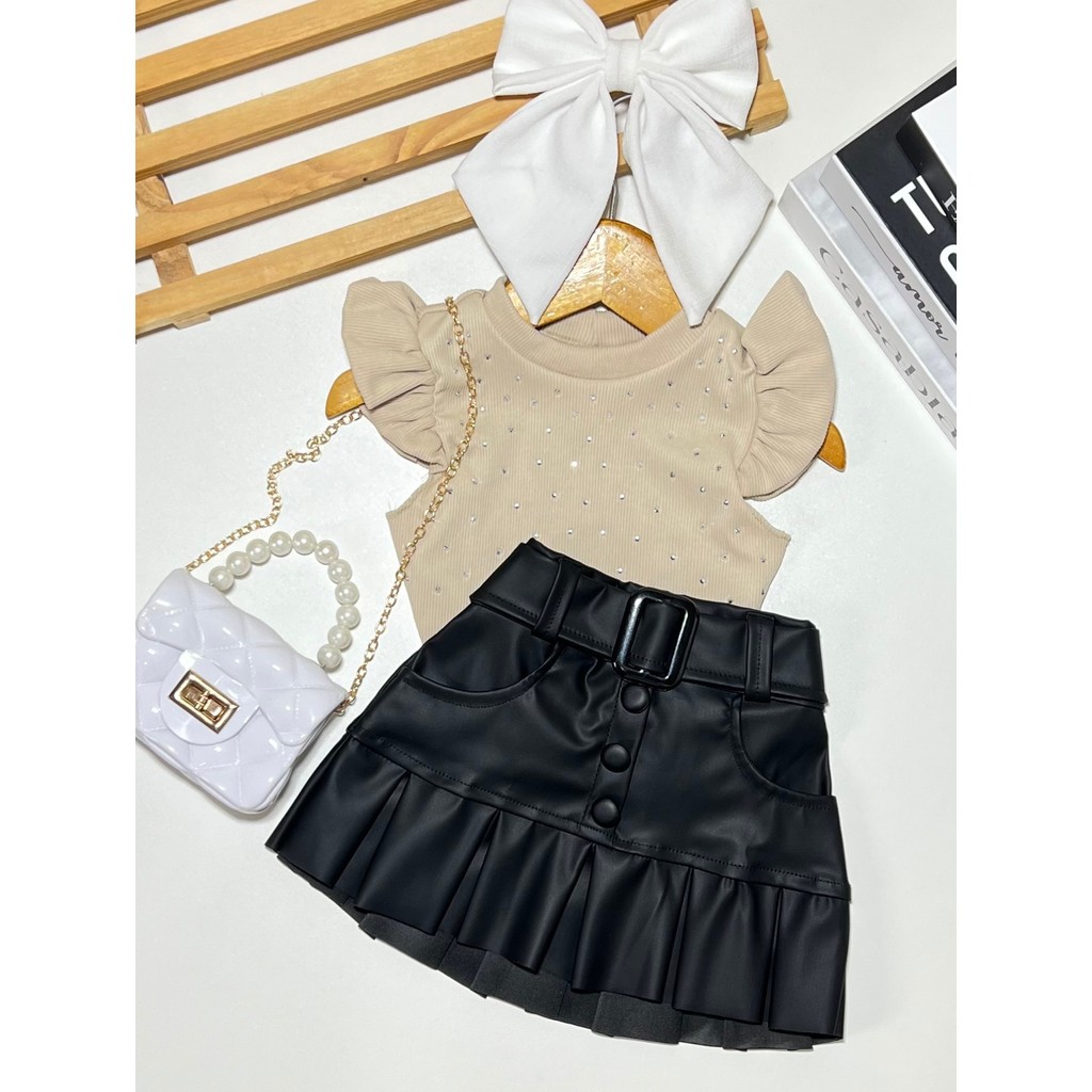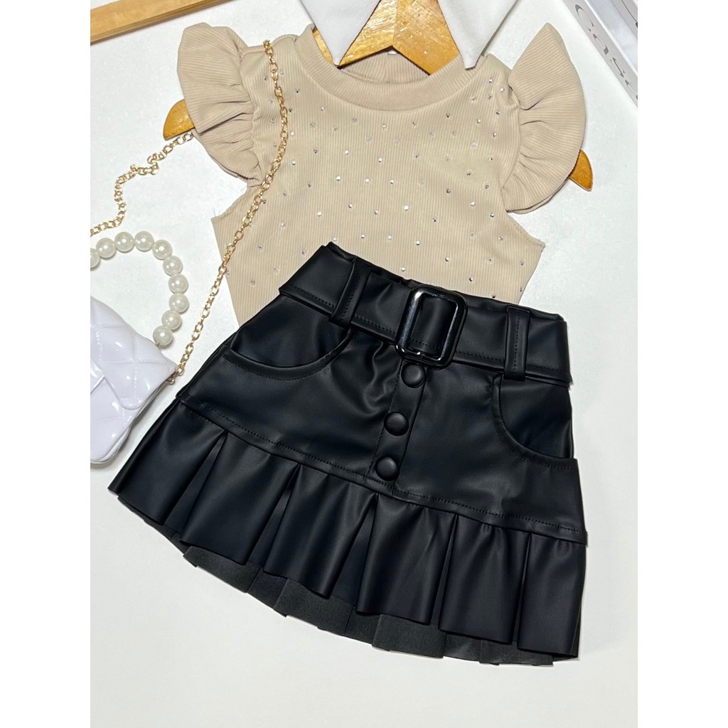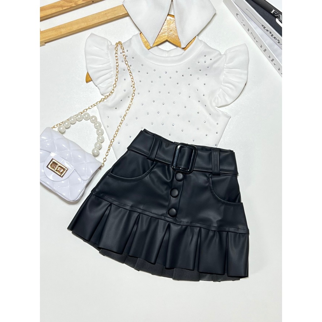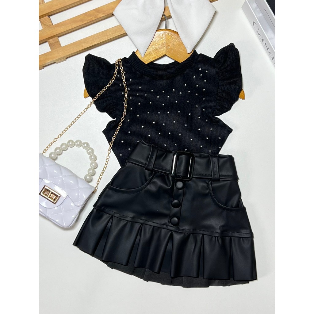 Conjunto 2 Peças Infantil Menina Saia Plissada e Blusa com Brilho Verão Passeio