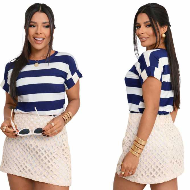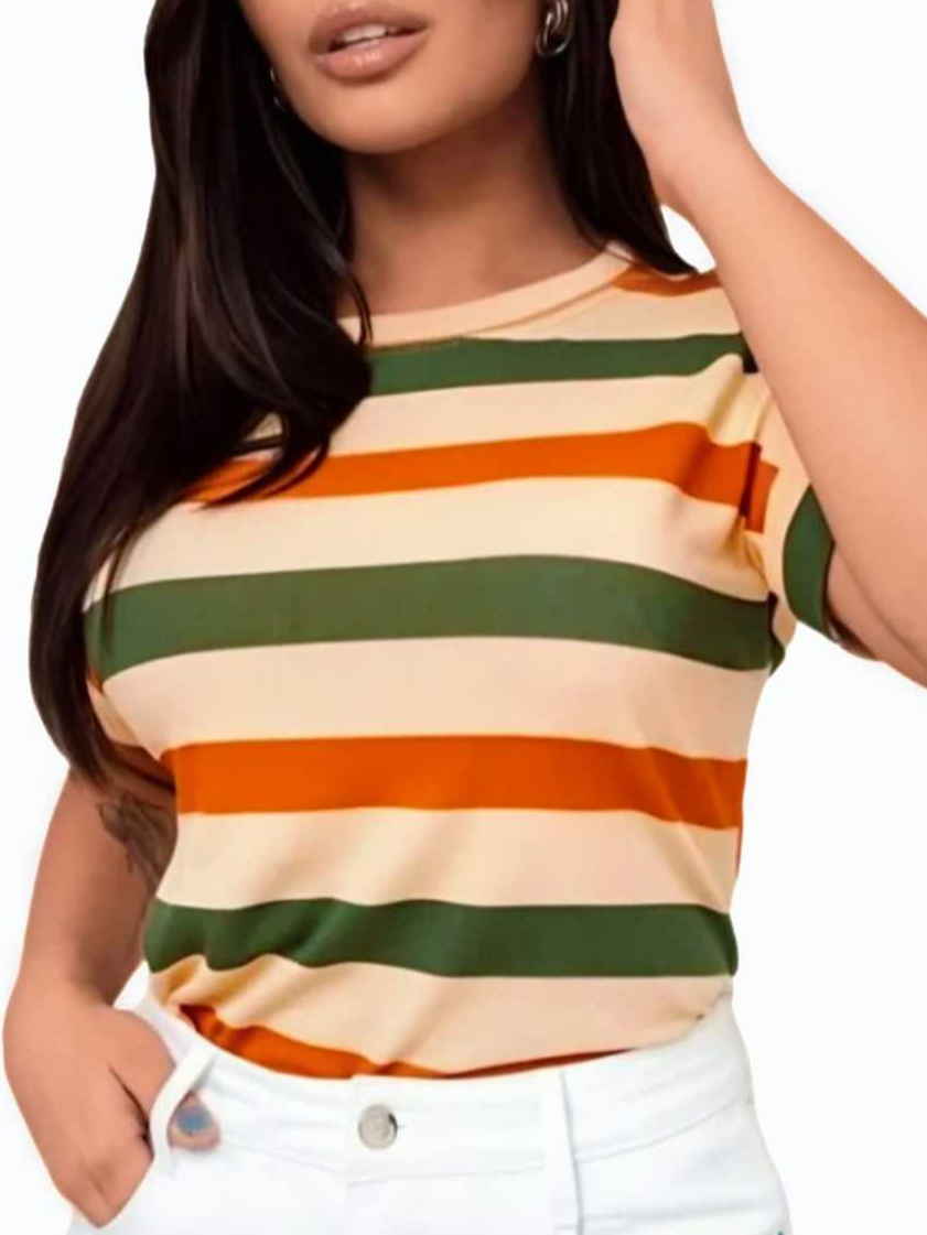 Blusa Camiseta Básica T-shirts Listrada Feminina Manga Japonesa Moda Verão Inverno Lançamento Marrom Elegante