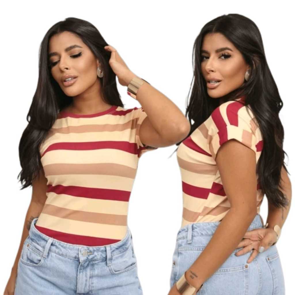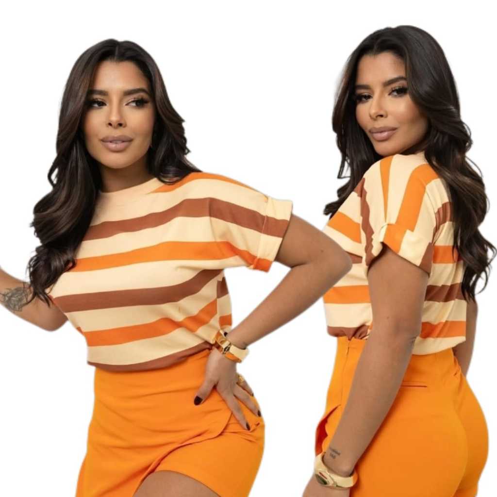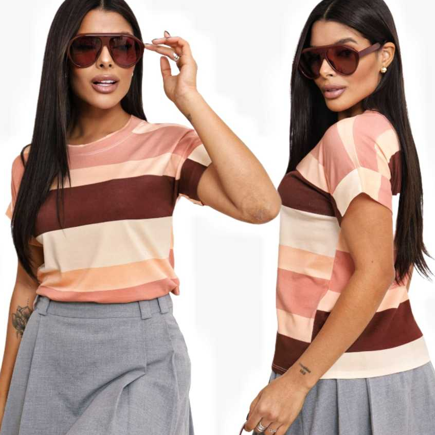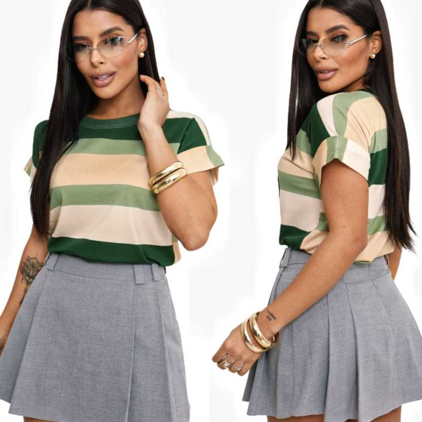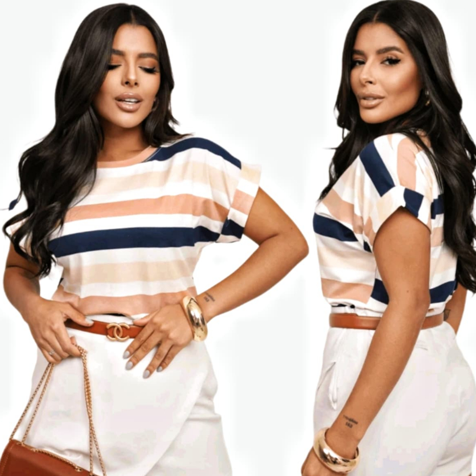 Blusa Camiseta Listrada Feminina Moda Verão Manga Japonesa Tendencia Estilosa e Moderna Malha Fria