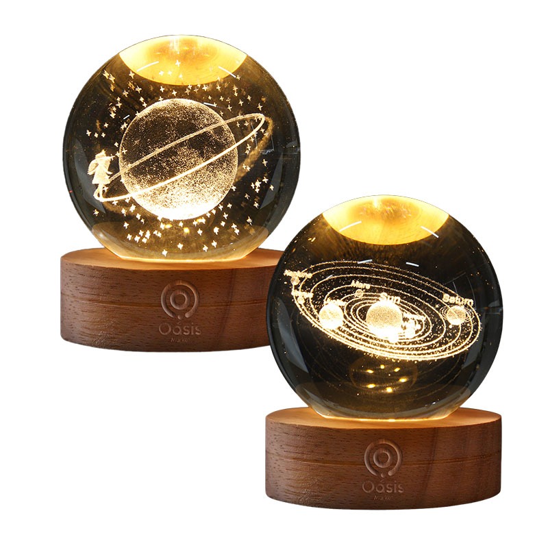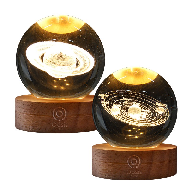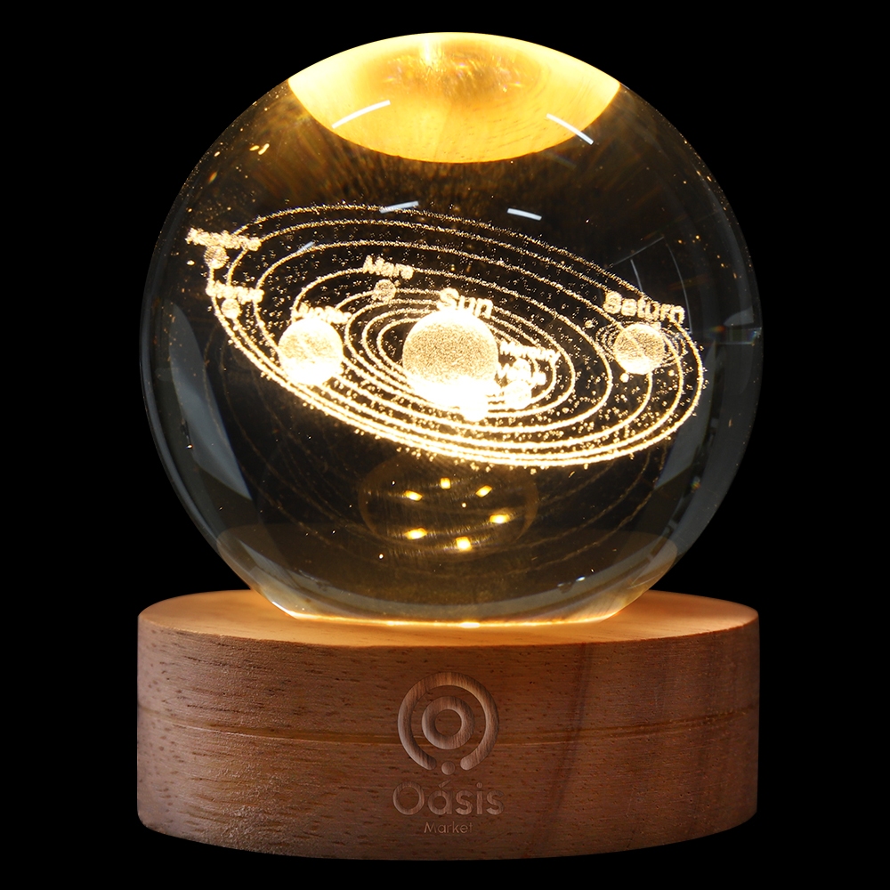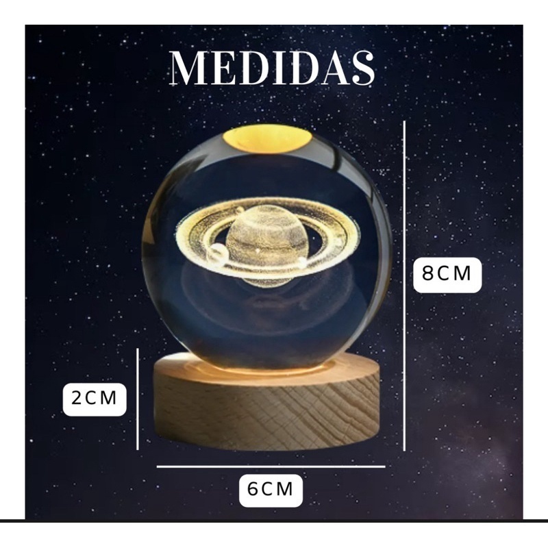 Luminária Cristal de Mesa Sistema Solar Saturno Lua Galáxia LED Base Madeira Enfeite Decorativo