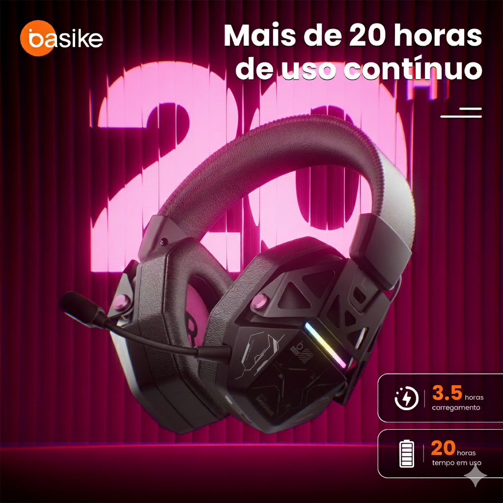 Headset Gamer Basike Boreas V2 Fone Conexão Tripla Bluetooth Sem Fio 7.1 Surround RGB com Microfone e Bateria 20h
