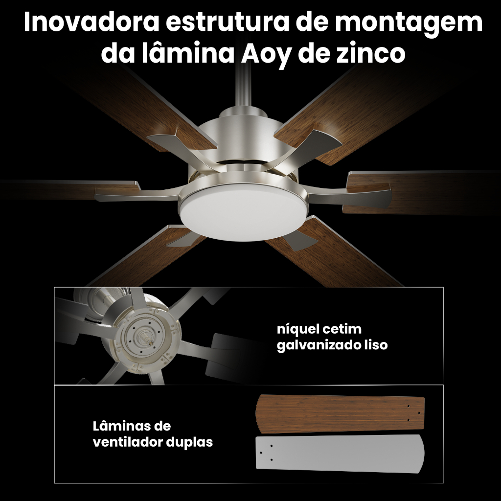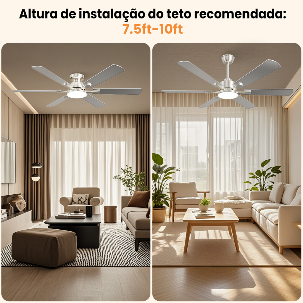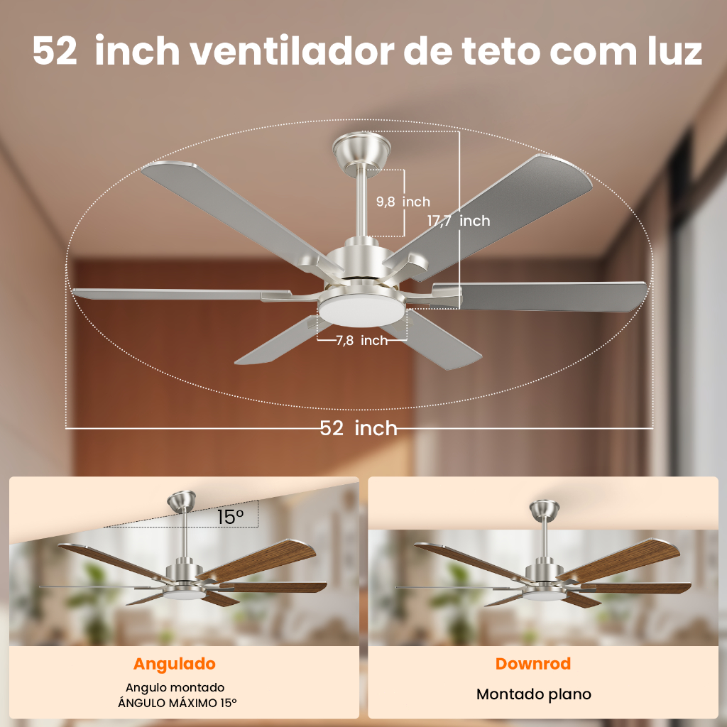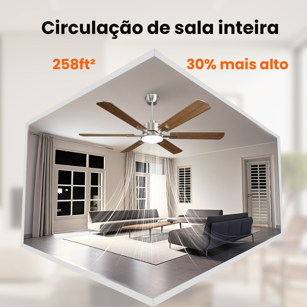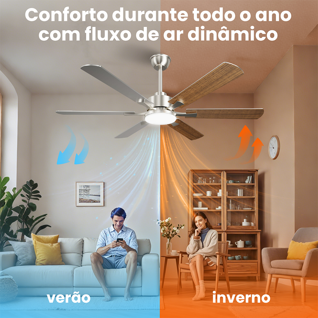 Ventilador de Teto 52" Luz LED 20W 3 Cores Controle Remoto 6 Pás 6 Velocidades Timer Econômico Silencioso Bivolt