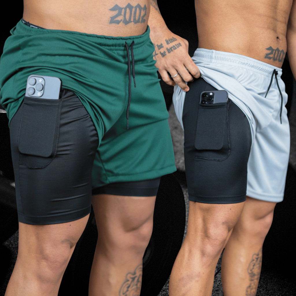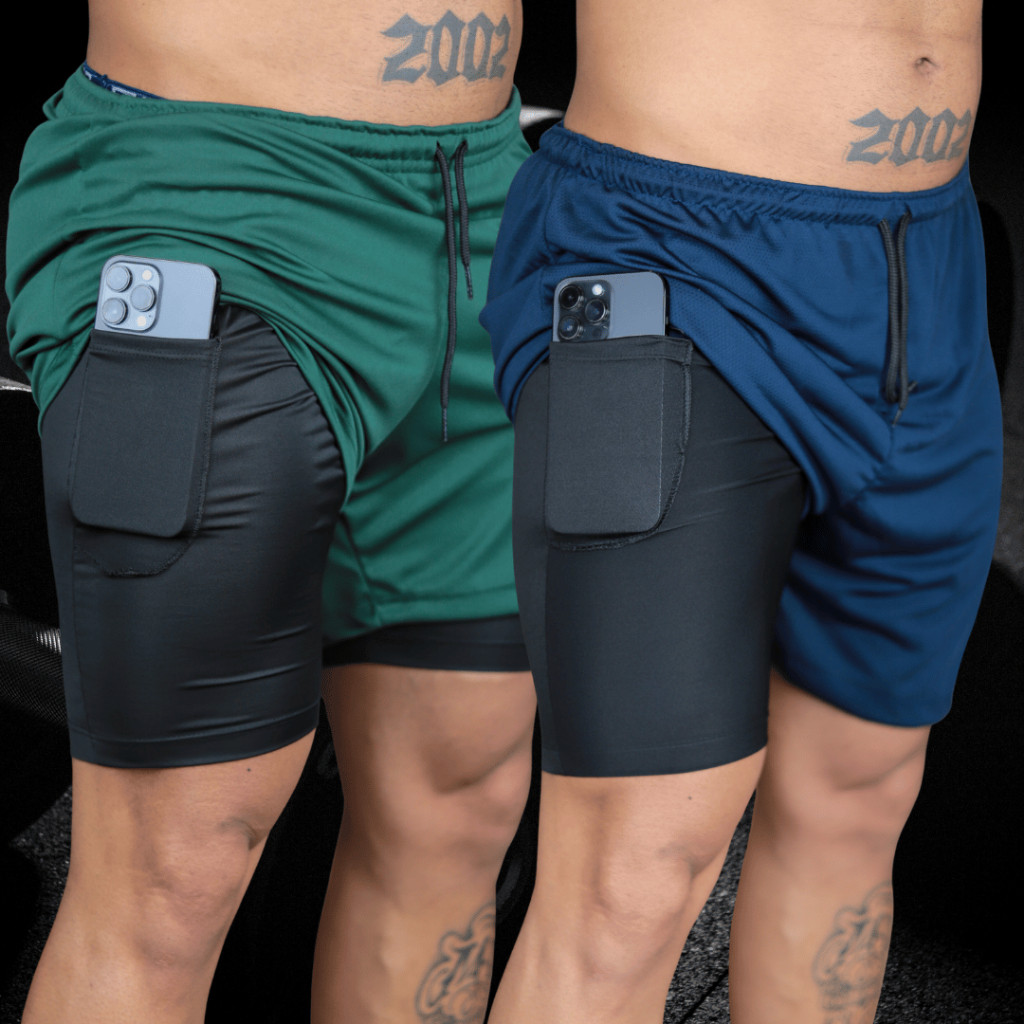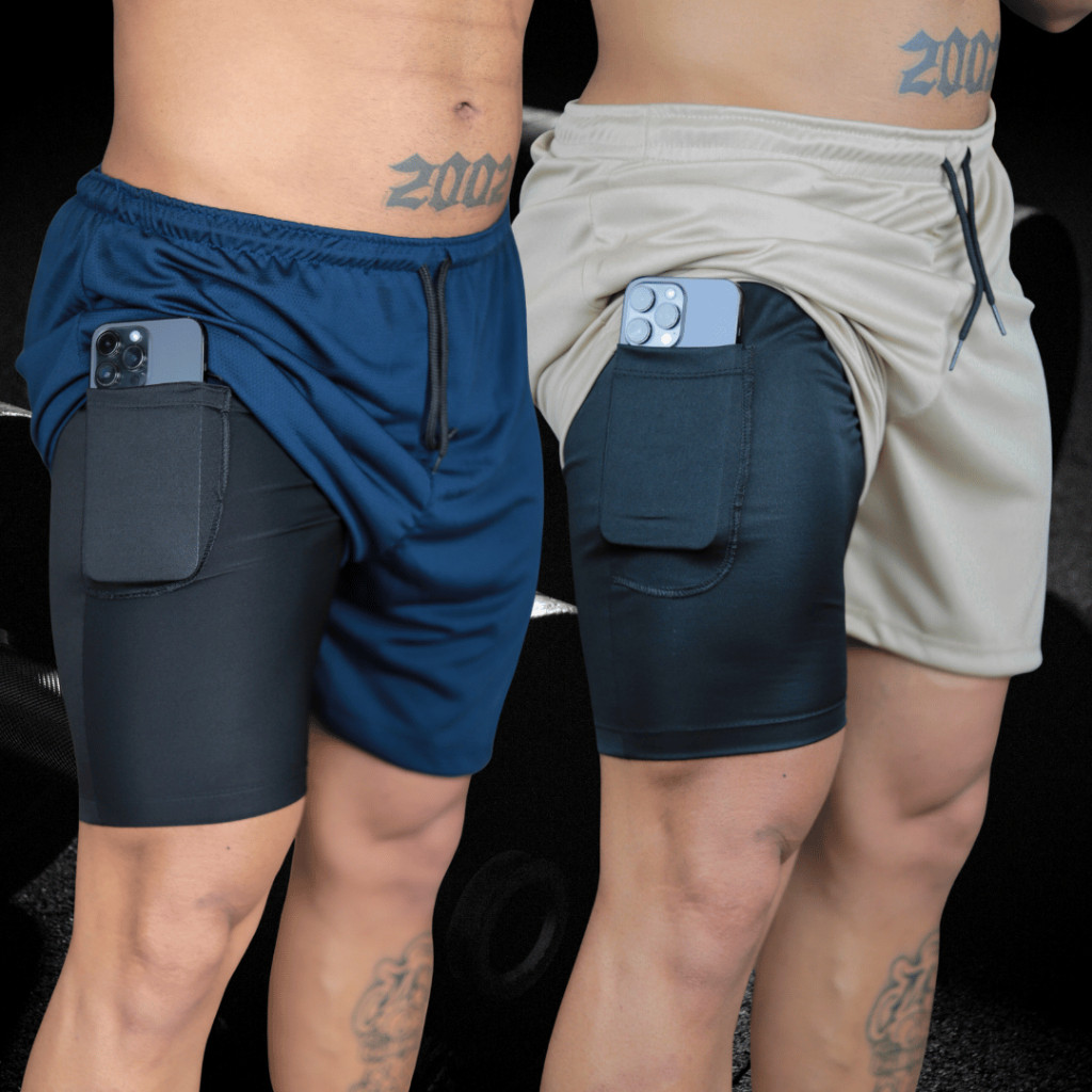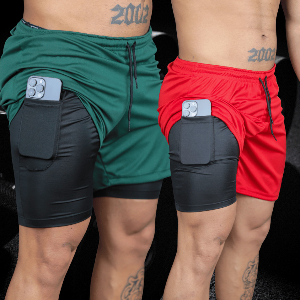 KIT 2 Shorts 2 em 1 Bermuda Dupla Academia Com Bolso Interno Nvidade