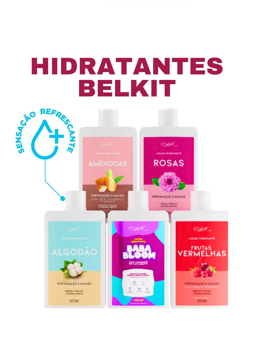 Kit Hidratante Corporal Belkit BRK 475ml Amêndoas Rosas, Algodão, Baba Bloom, Frutas Vermelhas