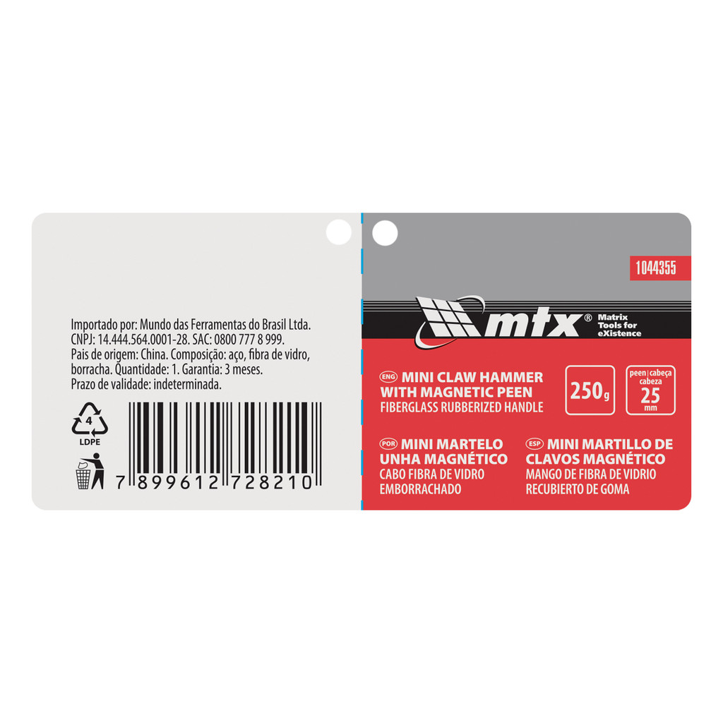 MINI MARTELO UNHA, CABO EM FIBRA DE VIDRO EMBORRACHADO, CABECA 25MM MAGNETICA, 1PC // MTX