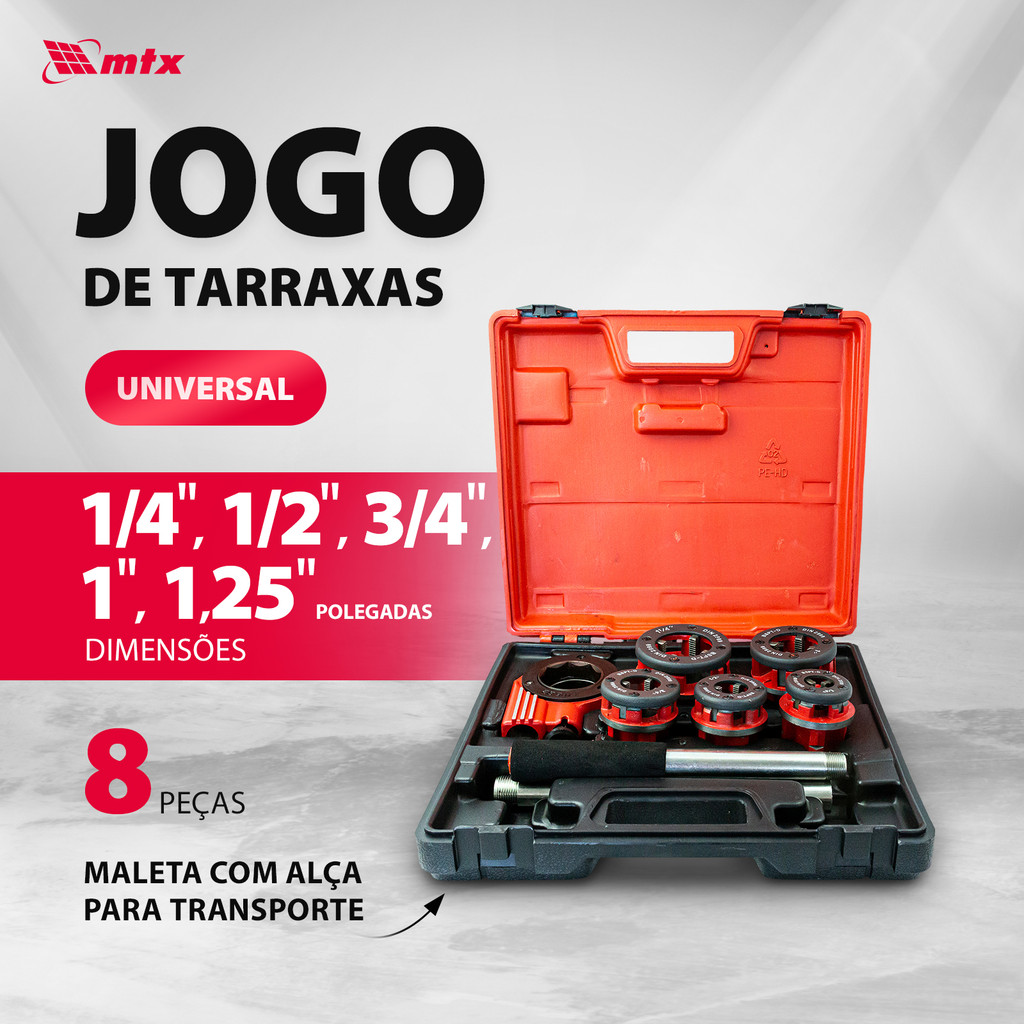 JOGO DE TARRAXA ROSCA PORTA COSSINETE COM CATRACA, 1/4-1/2-3/4-1-1.1/4POL., 8PCS // MTX