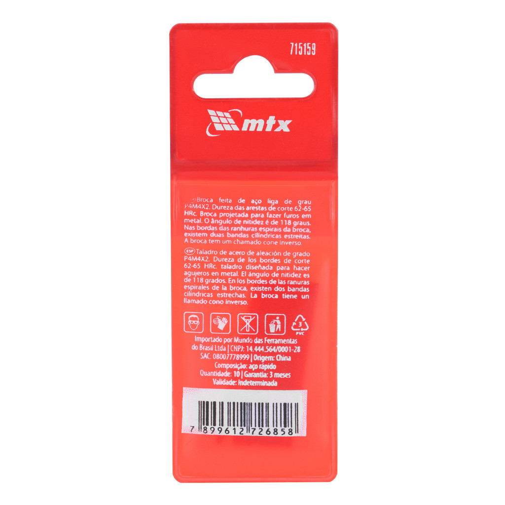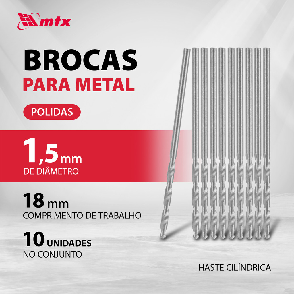 BROCA ACO RAPIDO STANDARD, PARA METAL, POLIDA, HASTE CILINDRICA, 1,5MM, 10PCS // MTX