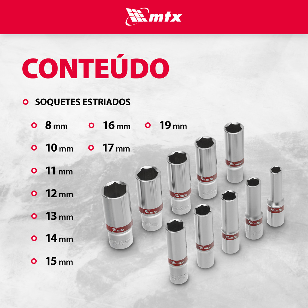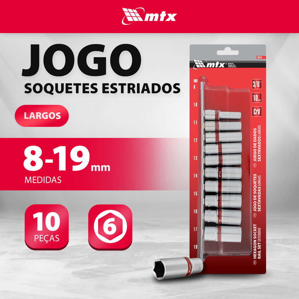 JOGO DE SOQUETE SEXTAVADO LONGO ENCAIXE 3/8POL., CROMO VANADIO, 8-19MM, 10PCS // MTX