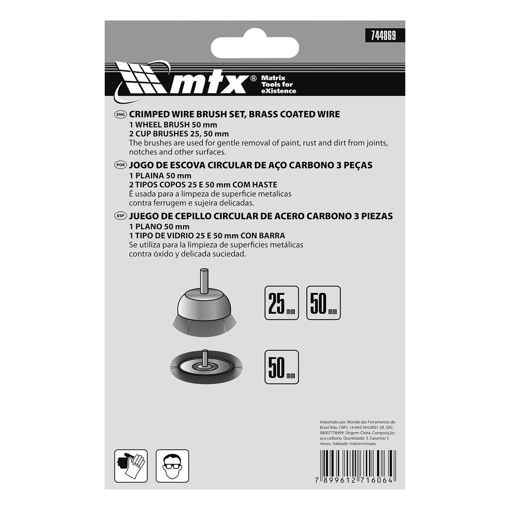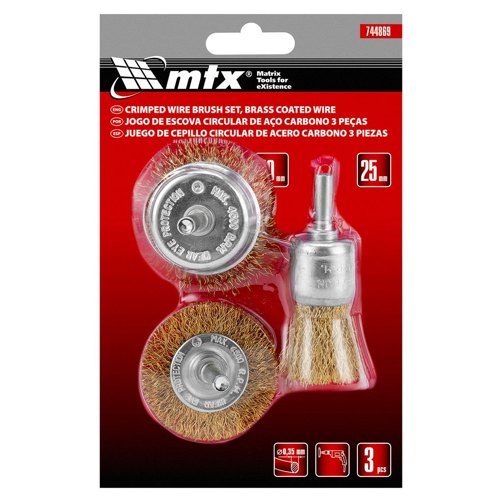 JOGO DE ESCOVA LATONADA, 1 PLANA 50MM, 2 TIPO COPO 25-50MM, COM HASTE, 3PCS // MTX