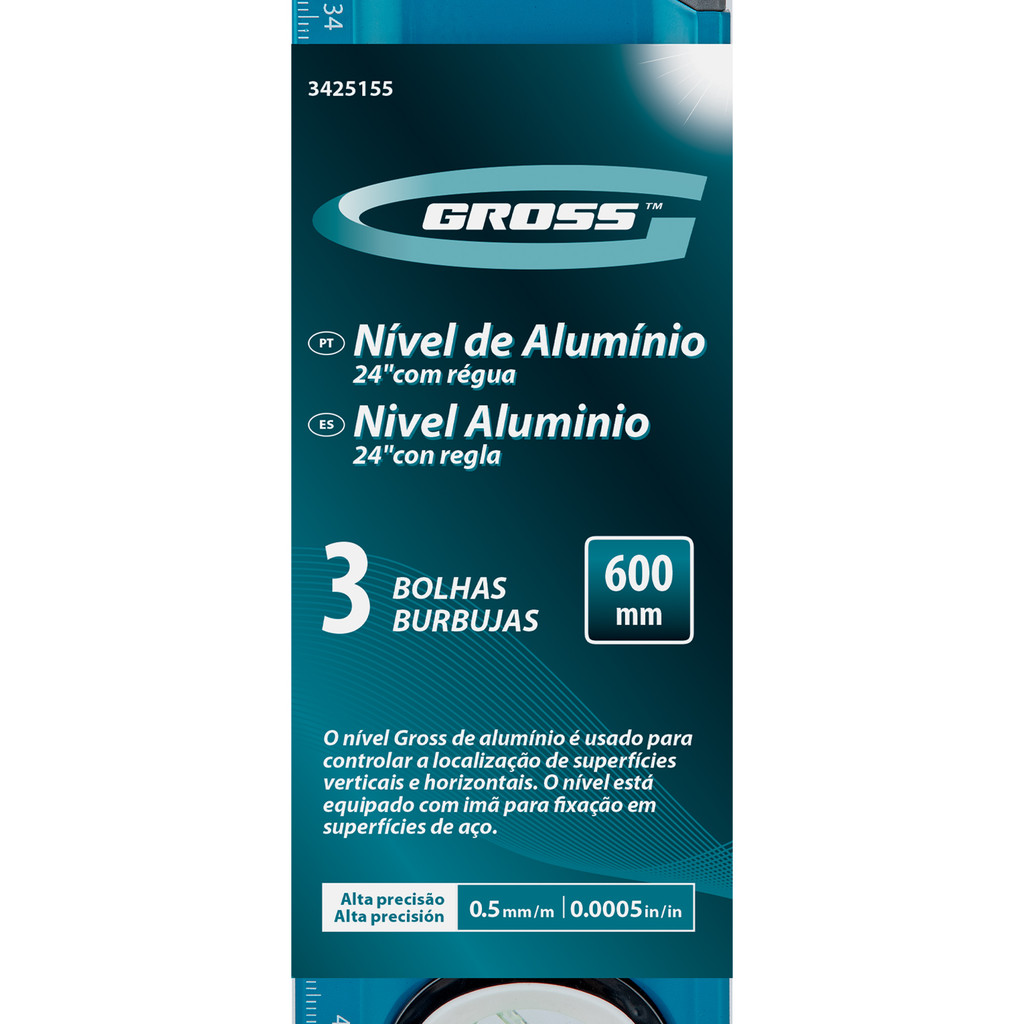 NIVEL DE ALUMINIO, MAGNETICO, 3 BOLHAS, 24POL., 600MM, 1PC // GROSS