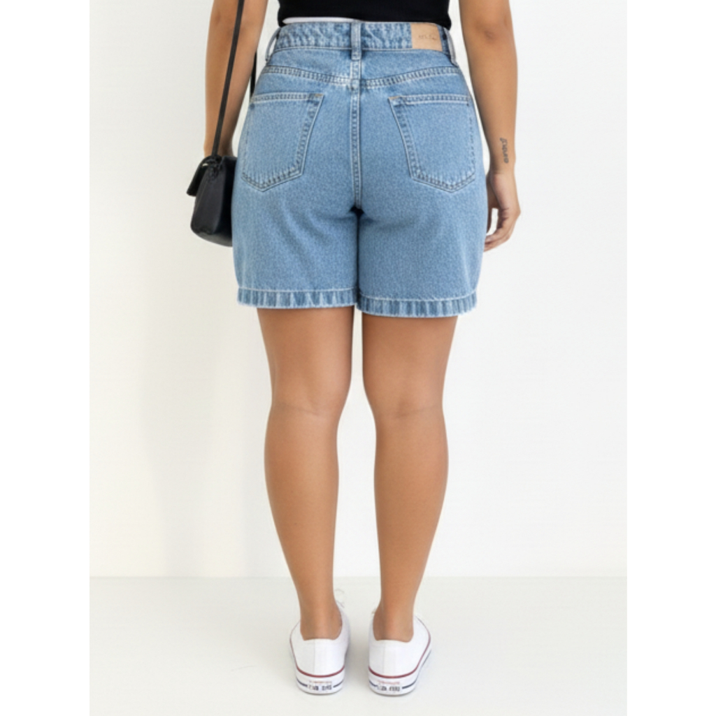 Bermuda Feminina Jeans Mom Pedal Sem Lycra Cintura Alta Comprida Marmorizada Confortável Elegante